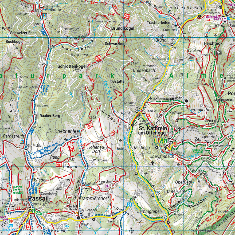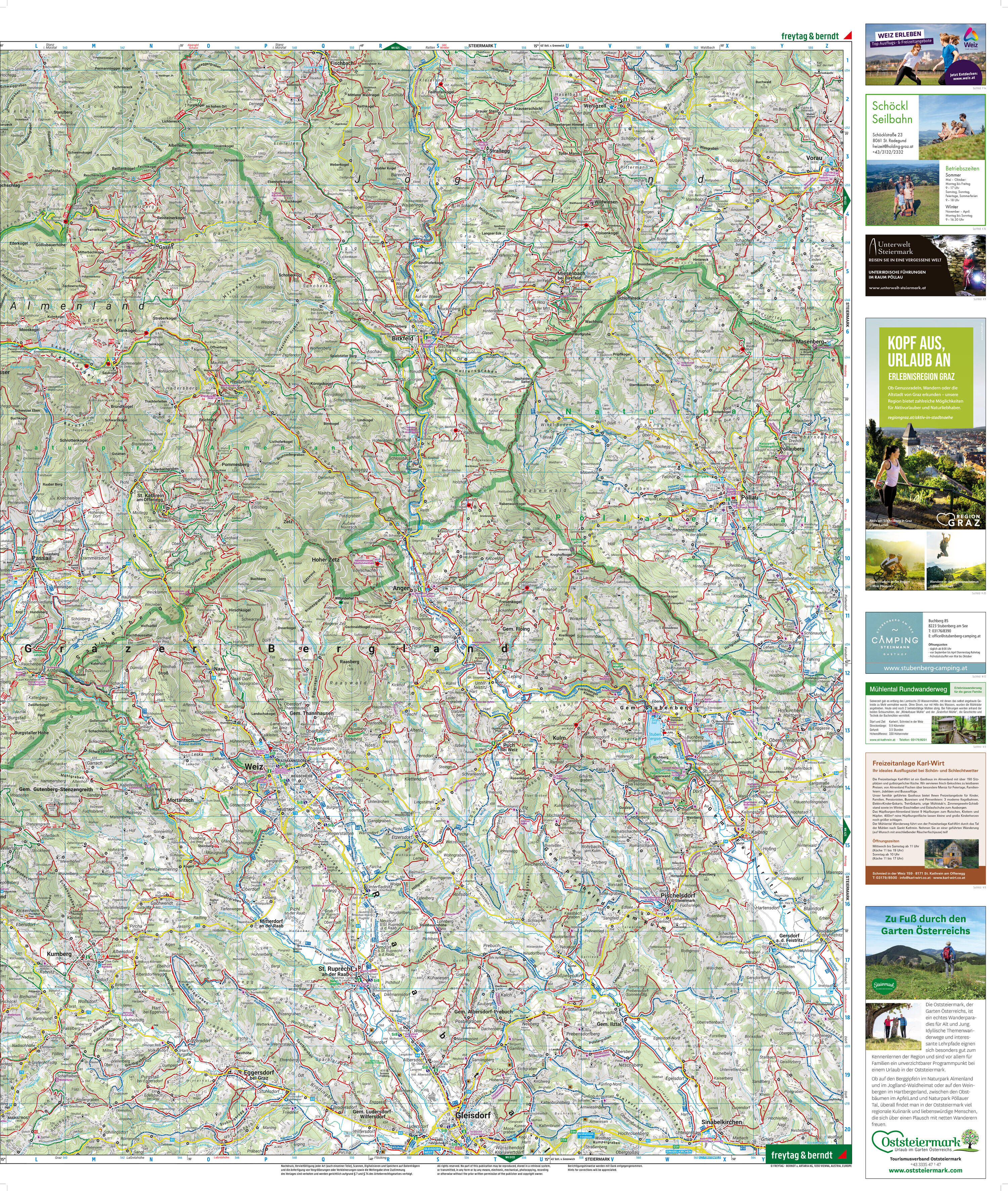 Die Wander-, Rad- und Freizeitkarte Grazer Bergland bietet detaillierte Informationen über die verschiedenen Wander- und Radwege in der steirischen Region. Der Schöckl, Stubenbergsee und die Raab sind nur einige der weiteren touristischen Highlights in der Geg...