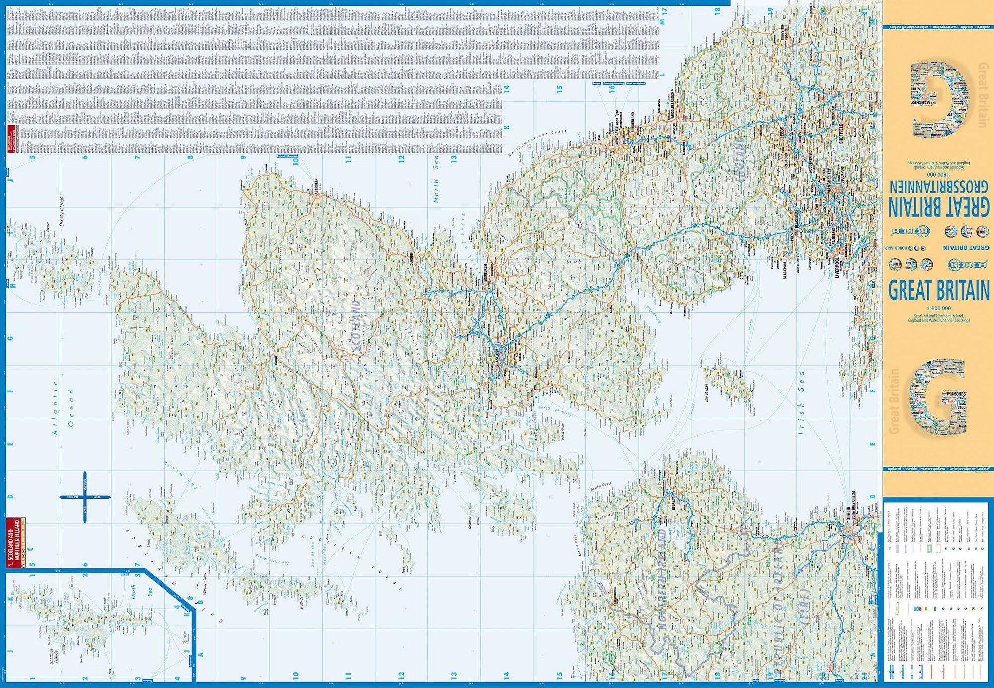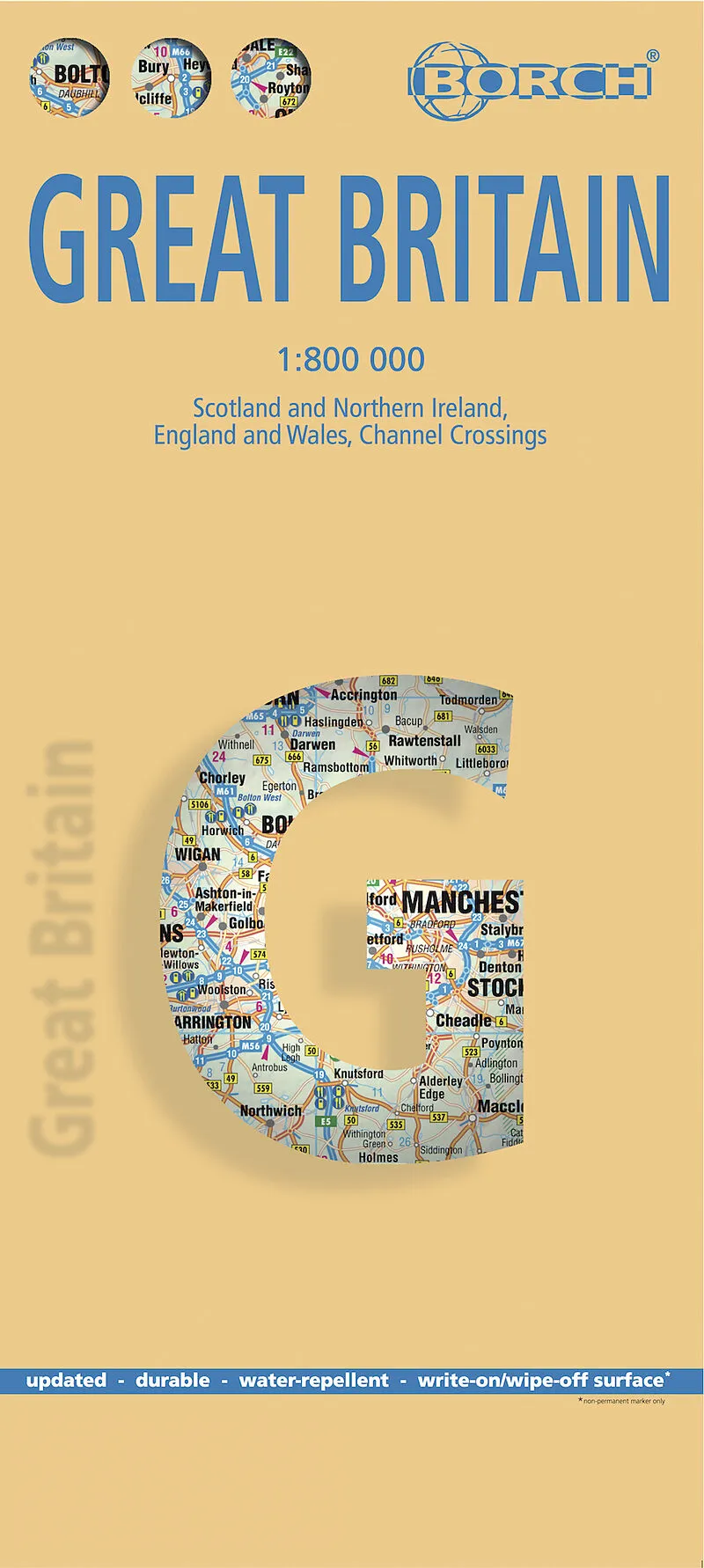Our laminated and folded Borch Map of Great Britain in the 13th edition contains: Scotland and Northern Ireland 1:800 000, England and Wales 1:800 000, ferry routes over the English Channel 1:800 000, an administrative map of Great Britain and Irelnd and the t...
