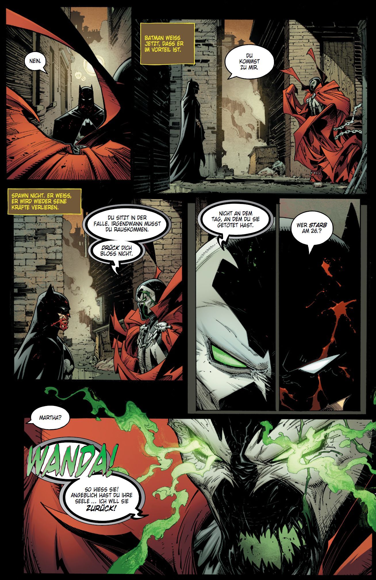 FINSTERE IKONEN von Christian Endres Mit diesem Band wird ein weiteres Mal Comic-Geschichte geschrieben: Zum ersten Mal in diesem Jahrtausend und erst zum dritten Mal überhaupt kommt es zum Treffen von Batman und Spawn in einem Crossover! Und dabei prallen gleich mehrere Legenden aufeinander Batman, geschaffen von Bob Kane und Bill Finger, wacht seit 1939 und US-DETECTIVE COMICS 27 über Gotham City. Nach der Ermordung seiner Eltern Thomas und Martha Wayne, die nach einem Kinobesuch in einer Gasse für eine Perlenkette sterben mussten, wurde Bruce von Butler Alfred Pennyworth großgezogen. Als junger Mann trainierte der Wayne-Erbe auf der ganzen Welt, wurde ein meisterhafter Nahkämpfer und Detektiv und kehrte nach Gotham zurück, um hier aus der Bat-Höhle unter dem Anwesen Wayne Manor heraus seinen Kreuzzug gegen das Verbrechen zu starten. Der Dunkle Ritter, der mit seinen Fähigkeiten und seiner Hightech-Ausrüstung regelmäßig gegen den Killerclown Joker und andere Schurken antritt, wurde einer der größten und beliebtesten Superhelden überhaupt (obwohl Bats im Grunde gar keine übermenschlichen Superkräfte hat). Für den Fledermausmann stehen tausende Panel-Storys bei DC Comics und ein gewaltiges Franchise zu Buche. Er ist eine multimediale Ikone, die schon in den 1960ern so bekannt und allgegenwärtig war wie die Beatles oder James Bond. Der kanadische Zeichner Todd McFarlane steuerte 1987 vier US-Hefte der Traditionsserie DETECTIVE COMICS zum Batman-Mythos bei. Bei Marvel wurde McFarlane Ende der 1980er, Anfang der 1990er schließlich zu einem revolutionären Zeichner und Comic-Superstar. 1992 gehörte McFarlane zu den Mitbegründern des US-Verlags Image und startete seine eigene Spawn-Saga. Diese begann mit dem Elitesoldaten Al Simmons, der nach seinem Tod zu Spawn wurde, mit vielen übernatürlichen Fähigkeiten und einem Symbionten als intelligentem Kostüm (nur in den portal-artigen Todeszonen zwischen Erde, Himmel und Hölle schwanken seine Kräfte). Nicht zuletzt der Verlust seiner Frau Wanda ist es, der Al antreibt, sich immer wieder gegen das Böse zu stellen, etwa den dämonischen blauen Clown. Bis heute sah die Spawn-Serie ebenfalls einige Adaptionen in Film und Fernsehen sowie diverse Comic-Ableger (zuletzt um das Team namens Scorched, zu dem z. B. She-Spawn gehört). Mit über 300 US-Heften einer unabhängigen Serie schafften es McFarlane und Spawn 2019 sogar ins Buch der Rekorde. Das erste Comic-Crossover zwischen Batman und Spawn gestaltete Zeichner McFarlane 1994 zusammen mit Autor Frank Miller. Um das zweite Aufeinandertreffen im selben Jahr kümmerten sich Doug Moench, Chuck Dixon, Alan Grant und Klaus Janson. Damals waren Crossover mit den Helden verschiedener Verlage groß in Mode. Jetzt, in einer völlig anderen Ära, steht ein neues Abenteuer mit dem Mitternachtsdetektiv und dem Hellspawn an! McFarlane schreibt es selbst, und als Zeichner kam niemand anderes als Greg Capullo infrage. Immerhin illustrierte der Amerikaner ab 1993 viele, viele Spawn-Hefte, ehe er 2011 langjähriger Stammzeichner der BATMAN-Heftserie wurde und z. B. die ersten Duelle zwischen Bruce und der Geheimloge Rat der Eulen illustrierte (nach dem Relaunch des DC-Universums von 2011 wurde dem Joker übrigens auch die Gesichtshaut abgetrennt, die er später vorübergehend wie eine angenähte Maske trug). Genug der Vorrede. Viel Spaß mit diesem Comic-Ereignis, auf das wir fast 30 Jahre gewartet haben!