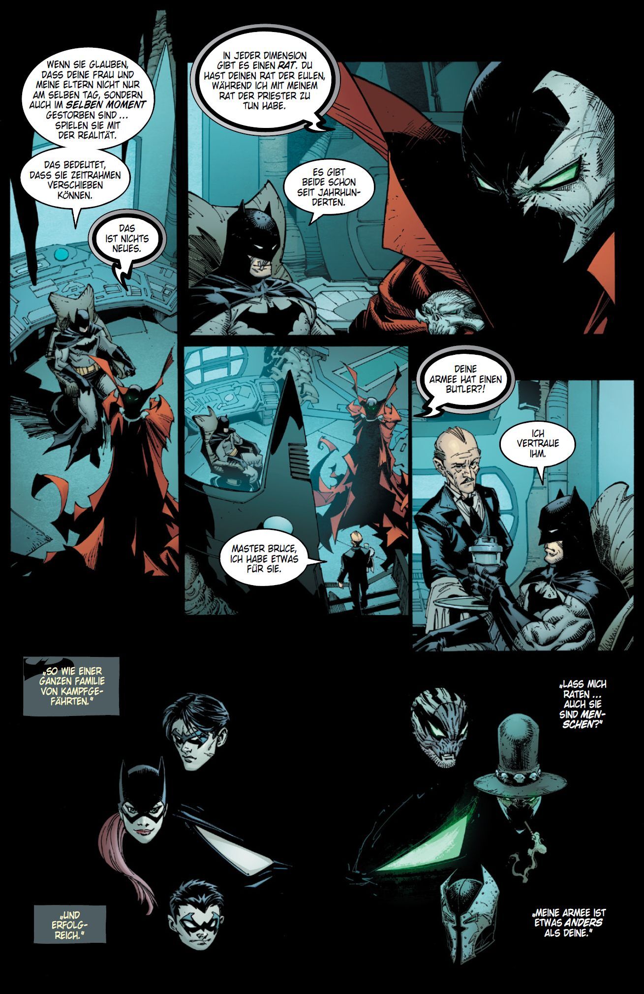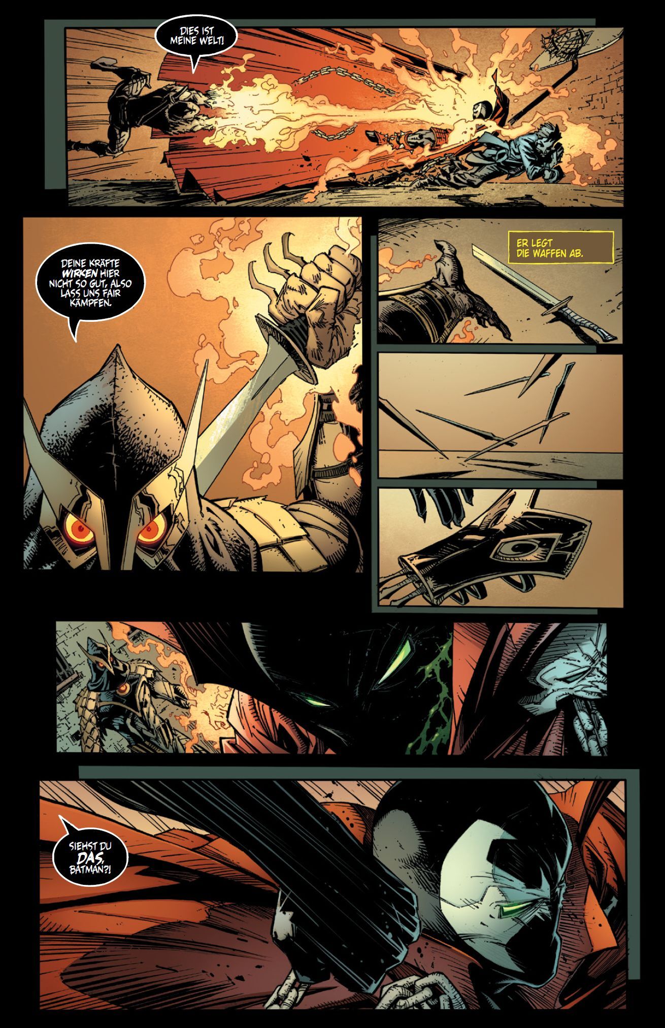 DIE DÜSTEREN HELDEN ZWEIER WELTEN In seiner Welt ist Bruce Wayne der finstere Held Batman, der über Gotham City wacht und dort gegen irre Kriminelle wie den Joker kämpft. Auf der Erde einer anderen Existenzebene wurde Al Simmons zum höllischen Helden Spawn, der das Böse bekämpft. Nun verschlägt es Spawn nach Gotham in die Realität des Dunklen Ritters. Dahinter stecken die finstere Geheimloge der Rat der Eulen und ein teuflischer Gegner von Spawn, und sie wollen die beiden düsteren Helden aufeinanderhetzen Das neue Crossover von BATMAN und SPAWN, inszeniert von Comic-Legende und Spawn-Schöpfer Todd McFarlane und dem langjährigen Batman- und Spawn-Zeichner Greg Capullo! ENTHÄLT: BATMAN/SPAWN (2022) 1