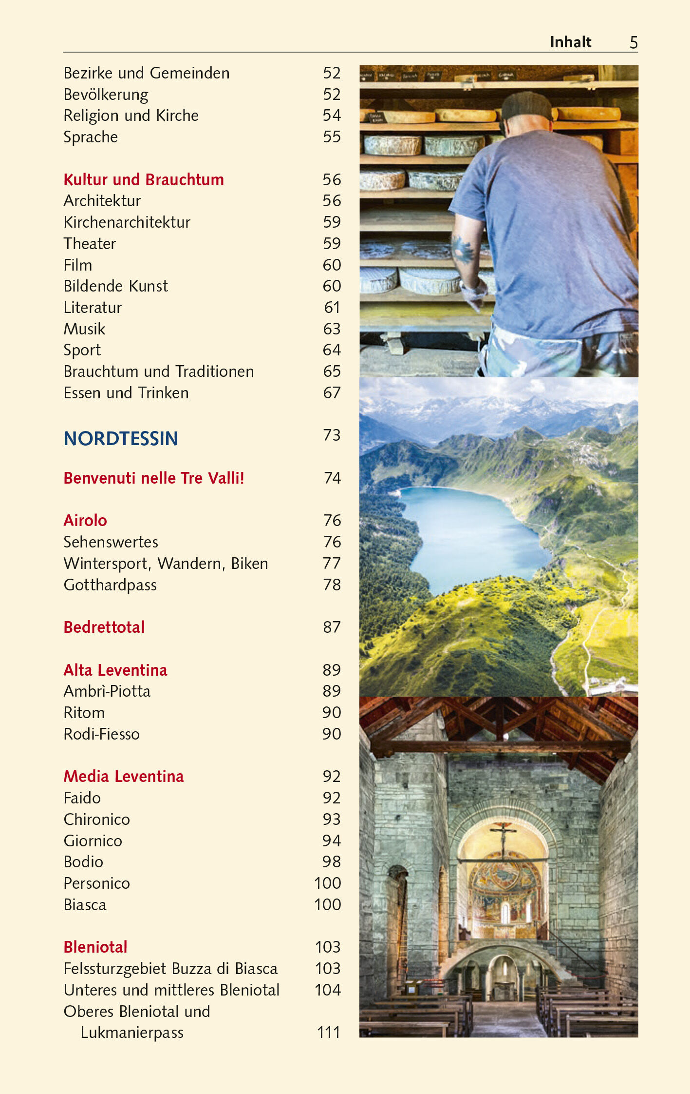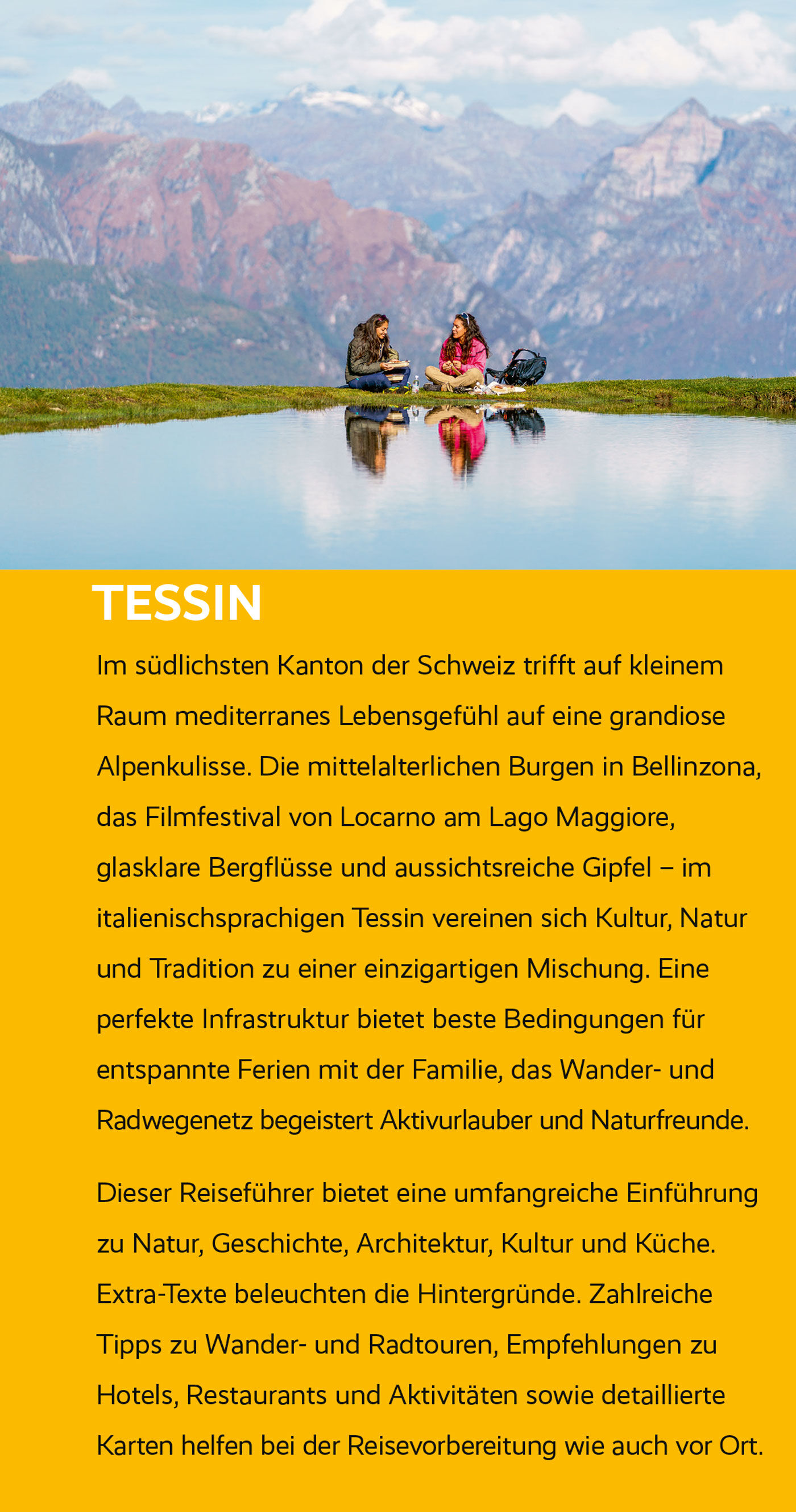Das Buch beschreibt ausführlich die große Fülle an Tessiner Natur- und Kulturschätzen und hat außerdem zahlreiche Wander- und Radelvorschläge parat. Denn mit 4300 Kilometern Wanderwegen und einem ebenso gut ausgebauten Radwegenetz ist das Tessin auch ein Paradies für Aktivurlauber. Flüsse, Bergbäche, Wasserfälle und über 100 Seen laden zum Baden ein, ergänzt um Wintersport in der kalten Jahreszeit.
