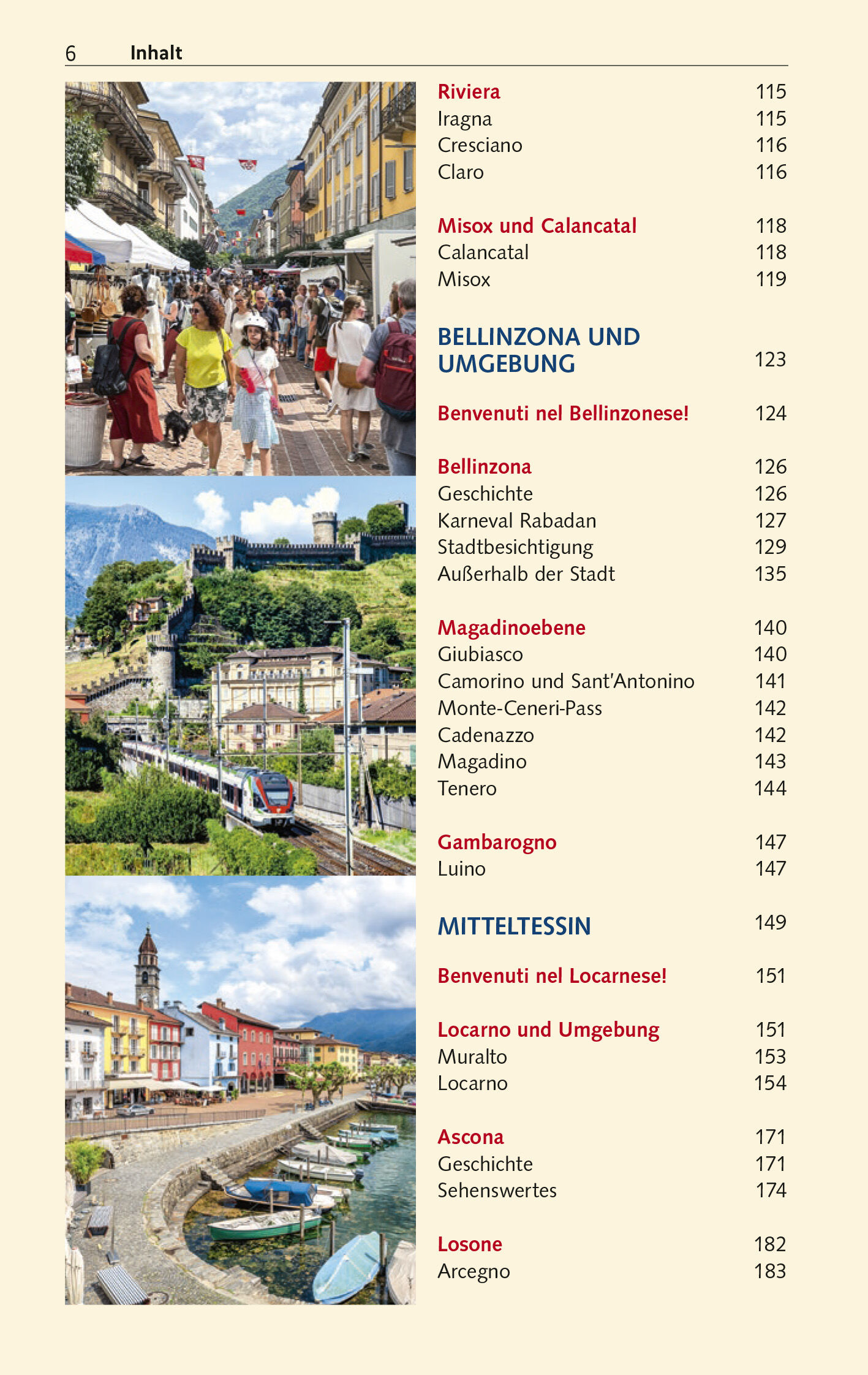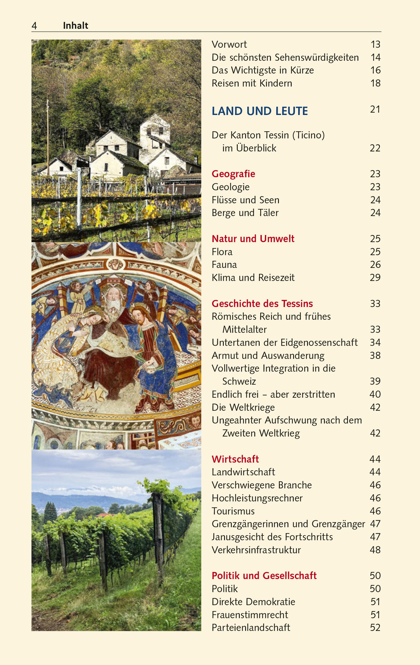 Vorwort 13 Die schönsten Sehenswürdigkeiten 14 Das Wichtigste in Kürze 16 Reisen mit Kindern 18 LAND UND LEUTE 21 Der Kanton Tessin (Ticino) im Überblick 22 Geografie 23 Geologie 23 Flüsse und Seen 24 Berge und Täler 24 Natur und Umwelt 25 Flora 25 Fauna 26 Klima und Reisezeit 29 Geschichte des Tessins 33 Rö…