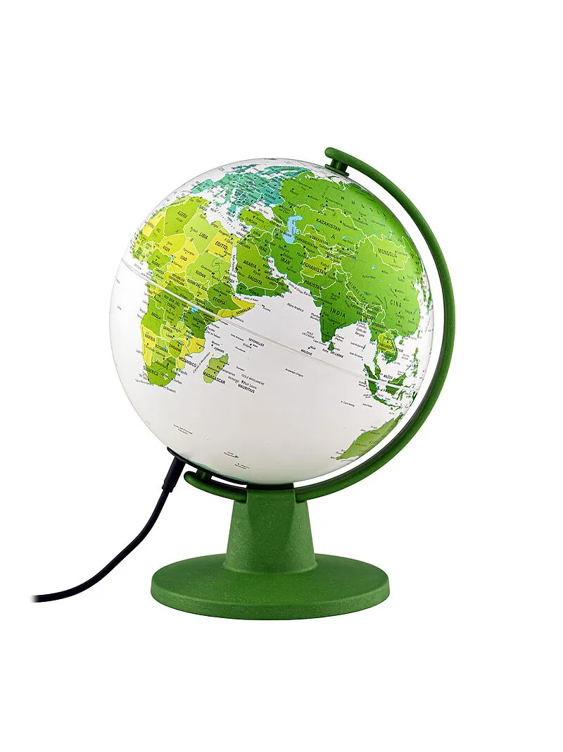 GRL 16, Miniglobus 16 cm Durchmesser mit grünem Kunststoffgestell, Kontinente in verschiedenen Grüntönen, USB-Kabel mit Schnurschalter. Es wird zusätzlich ein Netzstecker mit USB-Anschluß benötigt