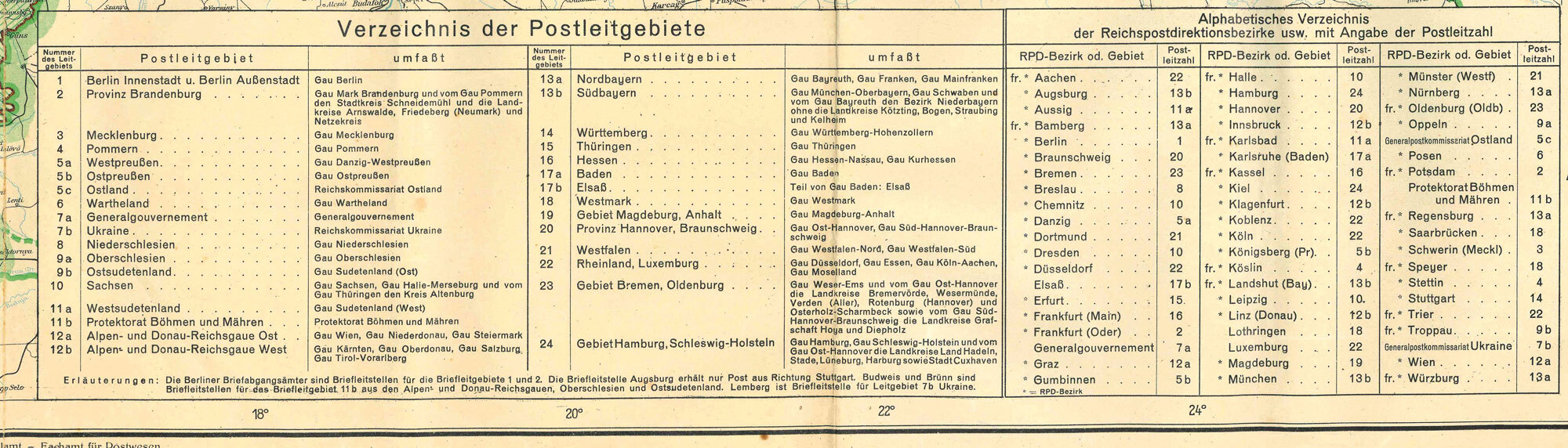 Farbenprächtiger Nachdruck. (B x H) 90 x 70 cm. Maßstab 1:1 500 000 um 16 % verkleinert zum Original. Plano. [Lieferung in einer sehr stabilen Pappversandhülse - bis 72 cm lang - 350 g] Postleit-Gebietskarte. Deutsches Reich nebst besetzten Gebieten (Ostland, ...
