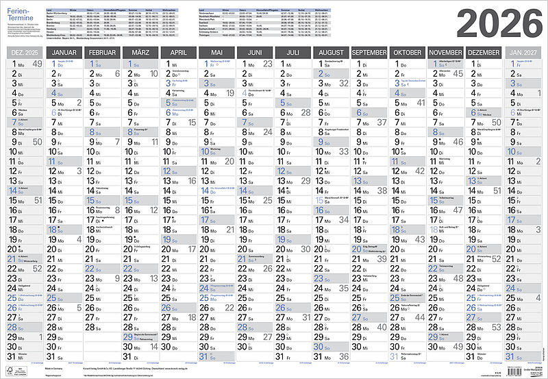 Produktmerkmale • Format: 97 x 67 cm • Kalendarium auf Deutsch mit hervorgehobenen Sonn- und Feiertagen für D, A und CH • Gedruckt auf stabilem umweltfreundlichen FSC Papier Praktische Jahresplanung auf einen Blick. 14 Monate. Mit Ferientermine...