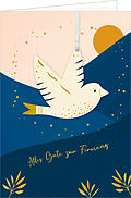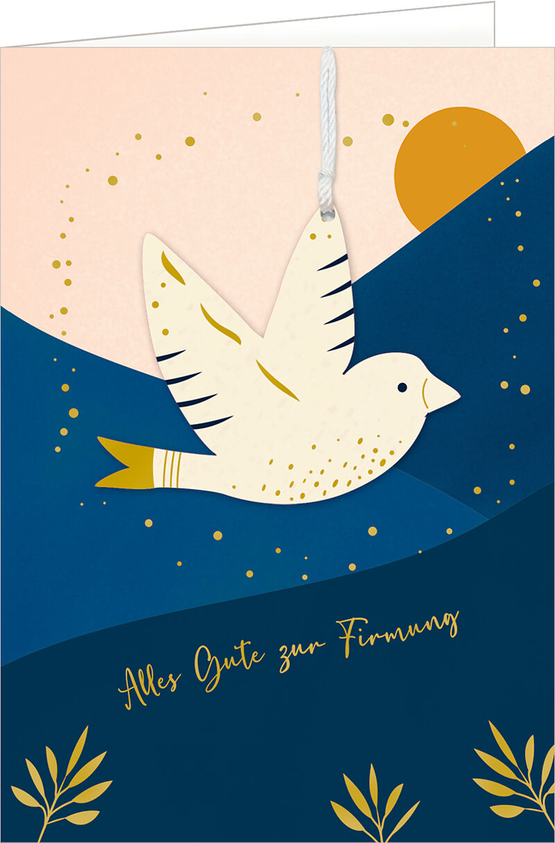 Ein festlicher Glückwunsch zur Firmung mit abnehmbarem Vogelanhänger und goldener Folienveredelung.
