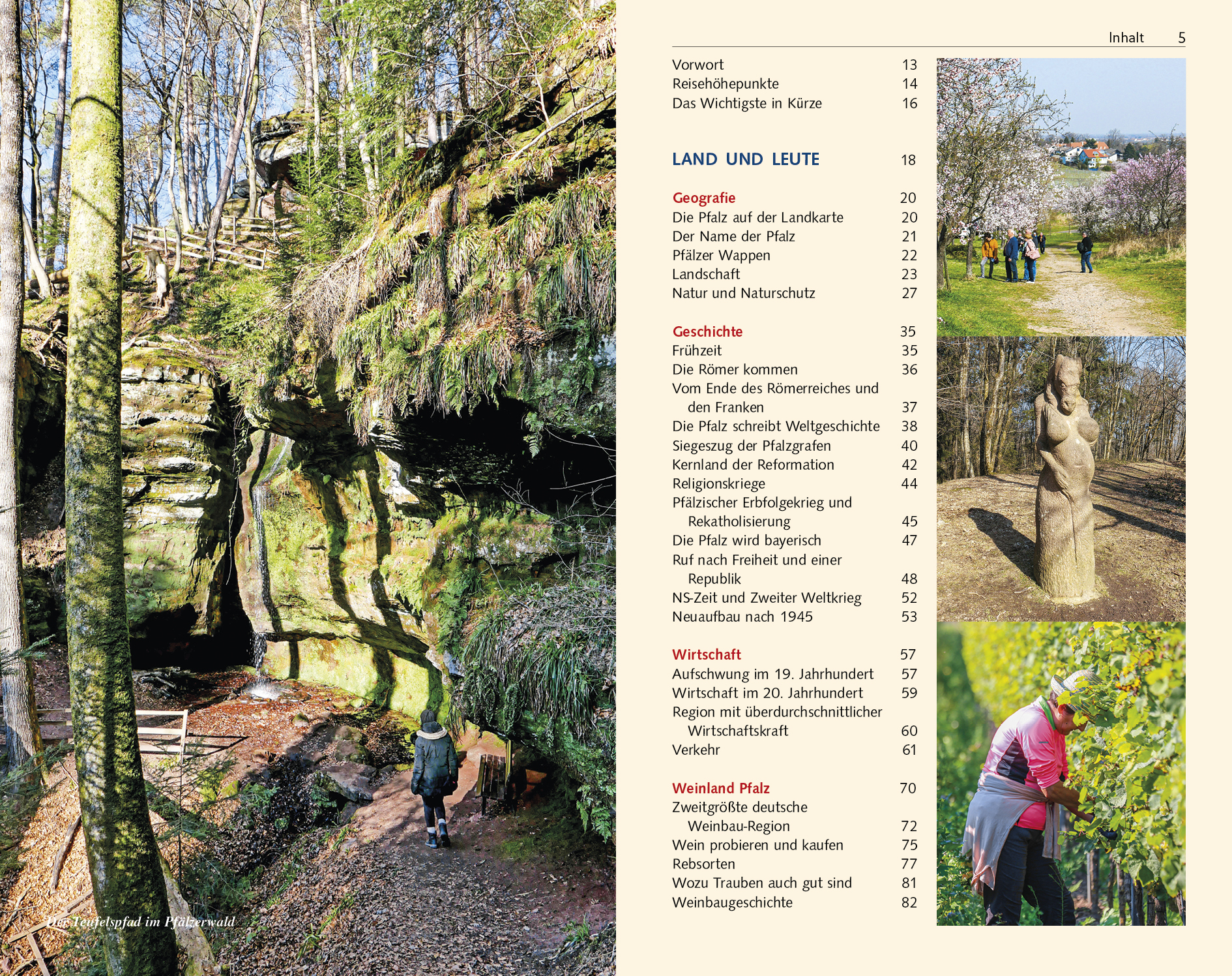 Vorwort 13 Reisehöhepunkte 14 Das Wichtigste in Kürze 16 LAND UND LEUTE 18 Geografie 20 Die Pfalz auf der Landkarte 20 Der Name der Pfalz 21 Pfälzer Wappen 22 Landschaft 23 Natur und Naturschutz 27 Geschichte 35 Frühzeit 35 Die Römer kommen 36 Vom Ende des Römerreiches und den Franken 37 Die Pfalz schreibt Weltgeschichte 38 Siegeszug der Pfalzgrafen 40 Kernland der Reformation 42 Religionskriege 44 Pfälzischer Erbfolgekrieg und Rekatholisierung 45 Die Pfalz wird bayerisch 47 Ruf nach Freiheit und einer Republik 48 NS-Zeit und Zweiter Weltkrieg 52 Neuaufbau nach 1945 53 Wirtschaft 57 Aufschwung im 19. Jahrhundert 57 Wirtschaft im 20. Jahrhundert 59 Region mit überdurchschnittlicher Wirtschaftskraft 60 Verkehr 61 Weinland Pfalz 70 Zweitgrößte deutsche Weinbau-Region 72 Wein probieren und kaufen 75 Rebsorten 77 Wozu Trauben auch gut sind 81 Weinbaugeschichte 82 Kunst, Kultur und …
