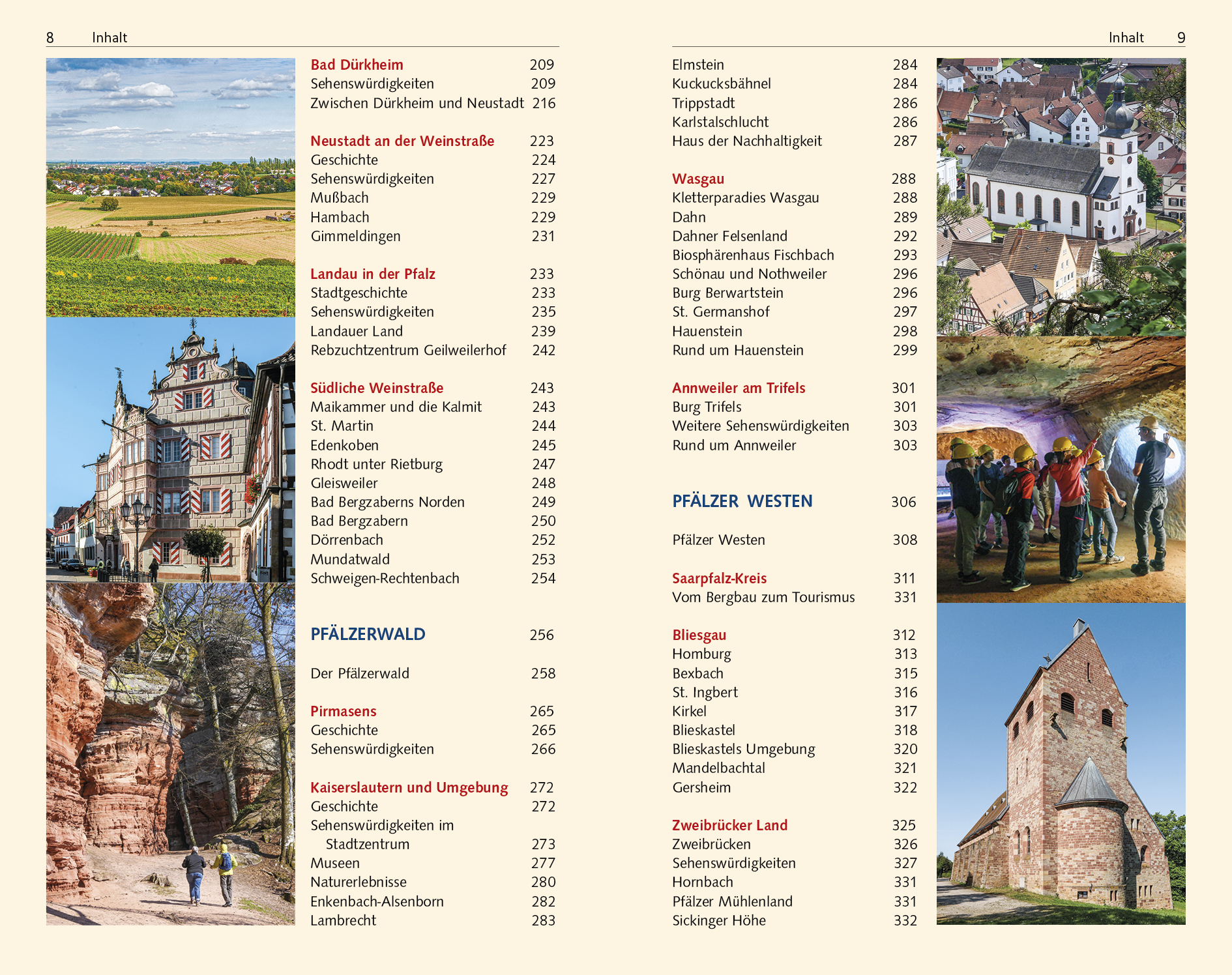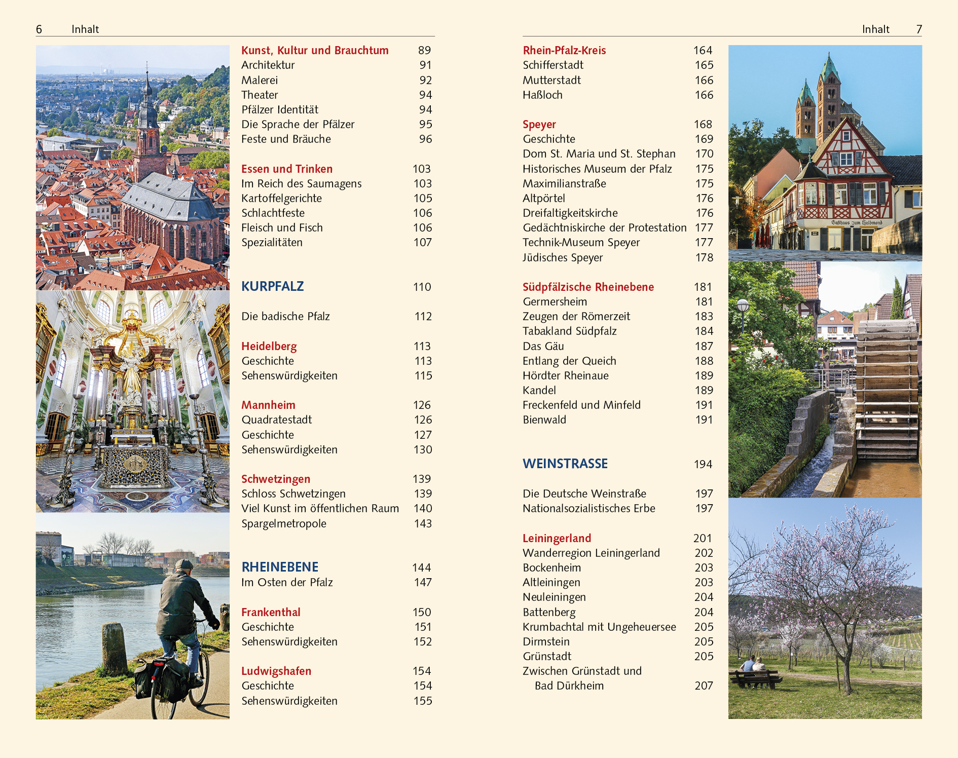 Seite 70 ROMANTISCHE RUINE Das Heidelberger Schloss > Seite 115 DIE GRÖSSTE ROMANISCHE KIRCHE DER WELT Dom zu Speyer > Seite 170 FACHWERKSTÄDTE UND STRAUßWIRTSCHAFTEN Die Deutsche Weinstraße > Seite 197 VON HUTTE ZU HUTTE Wandern im Pfälzerwald > Seite 258 FELSENRIFF AUS BUNTSANDSTEIN Die Altschlossfelsen > Seite 270 DAS PFÄLZER SAGENTIER Die Elwetritsche > Seite 295 WIE AUS DEM MÄRCHENBUCH Burg Trifels > Seite 301 VIELFÄLTIGE NATUR UND SANFTER TOURISMUS Biosphärenreservat Bliesgau > Seite 312 Die Pfalz ist ein Land mit vielen Gesichtern: mit dem dichtesten deutschen Waldgebiet im Pfälzerwald, endlosen Weinbergen entlang der Weinstraße, Deutschlands größtem Gemüsegarten und einmaligen Auenlandschaften in der Rheinebene. Der Dom zu Speyer, die weltweit größte romanische Kirche, malerische Fachwerkdörfchen und zahlreiche Burgen machen eine Reise in den Südwesten Deutschlands abwechslungsreich. Die Pfalz bietet eine Fülle von Freizeitmöglichkeiten, von Wandern, Radfahren und Reiten bis zu Klettern und Wassersport. Und weil die Pfalz historische Wurzeln in Baden und dem Saarland hat, haben auch die Saarpfalz und die einst kurpfälzischen Metropolen Mannheim und Heidelberg in diesem Buch Platz gefunden. Aktuell recherchierte Tipps zu Unterkünften vom Zelt bis zum Luxushotel, zu Gastronomie und Kultur sowie zahlreiche unterhaltsame und informative Texte zu den Besonderheiten der Pfalz und ihrer Bewohner machen diesen Reiseführer zu einem unentbehrlichen Reisebegleiter. >>> Detaillierte Informationen zu diesem Trescher-Reiseführer und vielen weitere Titel zu interessanten Reisezielen in Deutschland finden Sie auf der Website des Trescher Verlags.