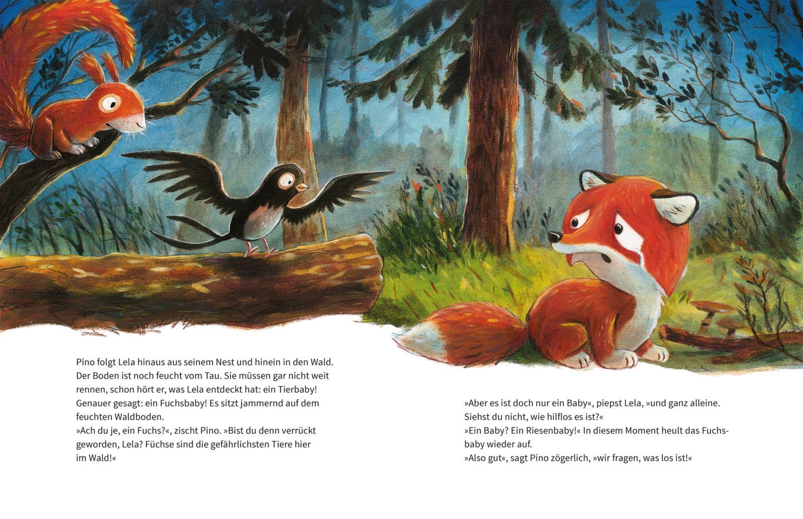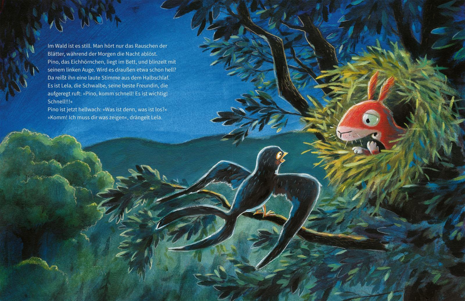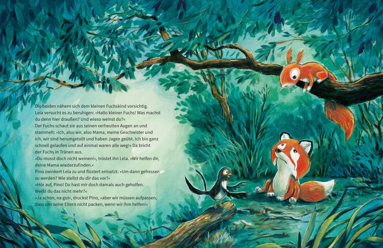 Eine Tier-Bilderbuchgeschichte übers Helfen und Zusammenhalt für Kinder ab 3 Jahren. Was ist denn das für ein Heulen und Wimmern mitten in der Nacht? Ein kleiner Fuchs, ganz allein. Die Schwalbe Lela und das Eichhörnchen Pino müssen ihm helfen! Doch wie solle...