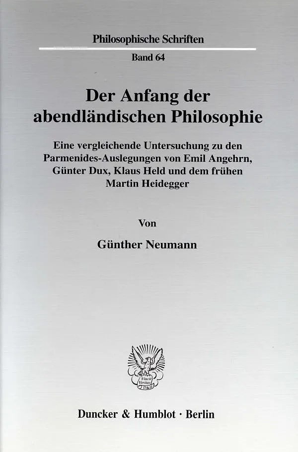 Den thematischen Schwerpunkt der Untersuchung bilden das seit Karl Reinhardts "revolutionierendem Buch" (Hans-Georg Gadamer) von 1916 aufgeworfene Problem des Zusammenhangs von Aletheia- und Doxa-Teil des Parmenideischen Lehrgedichts und die damit zusammenhäng...Den thematischen Schwerpunkt der Untersuchung bilden das seit Karl Reinhardts "revolutionierendem Buch" (Hans-Georg Gadamer) von 1916 aufgeworfene Problem des Zusammenhangs von Aletheia- und Doxa-Teil des Parmenideischen Lehrgedichts und die damit zusammenhängende Zeit-Problematik (Ausschluß des Werdens). Die in der Forschungsliteratur bezüglich der Aufhebung der Zeit vorliegenden Interpretationsansätze (Michael Theunissen und Richard Sorabji unterscheiden bis zu acht verschiedene Deutungen des Zeit- bzw. Ewigkeitscharakters) und die Problematik der räumlichen Begrenztheit, Kugelgestalt und Materialität des einen Seienden (tò eón) werden im einführenden Kapitel ausführlich erörtert. Heideggers frühe Parmenides-Auslegung hat durch die von Günther Neumann edierte Aristoteles-Vorlesung vom Sommersemester 1922 eine wesentliche Ergänzung erfahren. Die Reihenfolge der behandelten Autoren, von Emil Angehrn über Günter Dux, Klaus Held zu Martin Heidegger, soll aber nicht als ein "Aufstieg" zu Heidegger verstanden werden, sondern als eine wechselseitige hermeneutische Spiegelung, Vertiefung und Ergänzung. Aufgabe der Untersuchung ist es, sowohl die Gemeinsamkeiten der erörterten Parmenides-Auslegungen herauszustellen und so zu den eigentlichen Kernproblemen des frühen griechischen Denkens (in der Fortführung mythischer Denkstrukturen wie der Abgrenzung davon) vorzudringen als auch die Einseitigkeiten der jeweiligen Forschungsrichtungen und Fachdisziplinen durch eine wechselseitige Spiegelung und Erhellung zu überwinden. Auf diese Weise eröffnet Günther Neumann der Parmenides-Forschung neue Verständnismöglichkeiten.