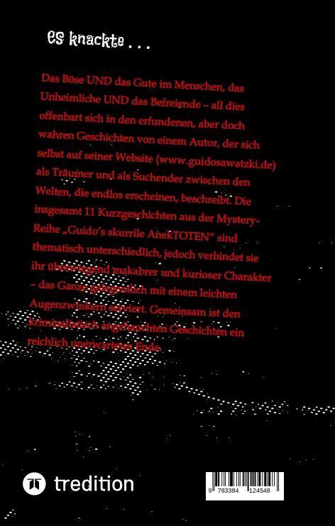 Das Böse UND das Gute im Menschen, das Unheimliche UND das Befreiende all dies offenbart sich in den Geschichten eines Autors, der sich selbst auf seiner Website (www.guidosawatzki.de) als Träumer und als Suchender zwischen endlosen Welten beschreibt. Die insgesamt 11 Kurzgeschichten des ersten Bandes der Mystery-Reihe Guidös skurrile AnekTOTEN sind thematisch unterschiedlich; sie verbindet ihr überwiegend makabrer und kurioser Charakter das Ganze mit einem leichten Augenzwinkern serviert. Die erste Geschichte dieser Anthologie Das eine Ende des Seils handelt von einer jungen Frau, die zum Tod durch den Strang verurteilt wurde. Peu à peu wird der Leser zum Kern der Geschichte geführt mit einem juckenden Strick und überraschendem Ende. Die Geschichte Alles gut erzählt von den Suizid-Versuchen einer Frau. Dem im Weg stehen Gedanken an die Menschen, denen sie dabei schaden könnte. Schafft sie es, ihre moralischen Skrupel beiseitezuschieben und ihr Vorhaben zu Ende zu bringen? Die Erzählung Als der Clown sprang schildert die Gefühle eines Mannes, der sich, als Clown verkleidet, vor den Augen zahlreicher vergnügter Zuschauer von einer hohen Klippe stürzen will. Von Schuldgefühlen geplagt ist er hin- und hergerissen. Wird er springen? Als die Schneeflocken nicht mehr schmelzen wollten berichtet von einer jungen Frau, die sich gerne nackt im Schnee vergnügt. So etwas erhitzt die Gemüter bei den ehrbaren Bürgern der Kleinstadt, in die sie gezogen ist, ganz gewaltig. In Hund zum Frühstück projiziert ein verschrobener Dorfbewohner den unendlichen Hass auf sich selbst zuletzt auf Hunde, nachdem er mit seinem Dasein voller Fehlschläge, seiner verkorksten Jugend und seinem, in allen Bereichen gescheiterten Leben nicht zurechtkommt. Der Dornbusch brennt erzählt von einem jungen Mann, der die Schatten seiner Vergangenheit endgültig abschütteln will. Zu diesem Zweck hat er seinen Freund eingeladen, den er seit 30 Jahren nicht gesehen hat und den er für schuldig an seinem Albtraum hält. Ein verunsicherter Sohn und eine dominante Mutter sind die beiden Hauptfiguren in Der Schönschreiber und die Krähe . Er wird in allen Lebensbereichen von seiner Mutter bevormundet und gegängelt. Schließlich zieht die Ehefrau die Reißleine. Eine sexbesessene Frau steht im Mittelpunkt von Die Farbe Blaü. Diese spielt nicht nur im Titel eine Rolle, sondern zieht sich auf perfide Art durch die ganze Geschichte, in der es um verletzte Gefühle, Ehebruch und Rache geht. In Dunkle Wasser verschwinden inmitten einer Landschaft voller Moore und Tümpel auf mysteriöse Weise nacheinander ein kleiner Hund und ein sechsjähriges Mädchen. Dort soll auch ein riesiger Hecht sein Unwesen treiben. Eine zuviel erzählt von der seelischen Zerrissenheit eines Mannes, der, obgleich gedemütigt und bis ins Mark getroffen, seine erste große Liebe nicht vergessen kann und vor nichts zurückschreckt - bis er an die Richtige gerät. Die Liebe zwischen zwei Frauen in Es knackte geht soweit gut, bis eine von ihnen erfährt, dass die andere anscheinend doch nicht ganz die Finger von den Männern lassen kann. Dass beide Frauen noch dazu im selben Geschäft arbeiten, verkompliziert die Angelegenheit.