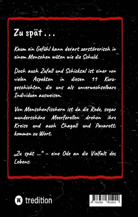 In Band 3 meiner Kurzgeschichtenreihe Guido's skurrile AnekTOTEN mit dem Titel Zu spät geht es um das Leben, wie wir es lieben - aber auch um die Angst davor. Das Böse und das Gute - im Menschen gehen beide eine Synthese ein, die sich ebenfalls in den Geschich...