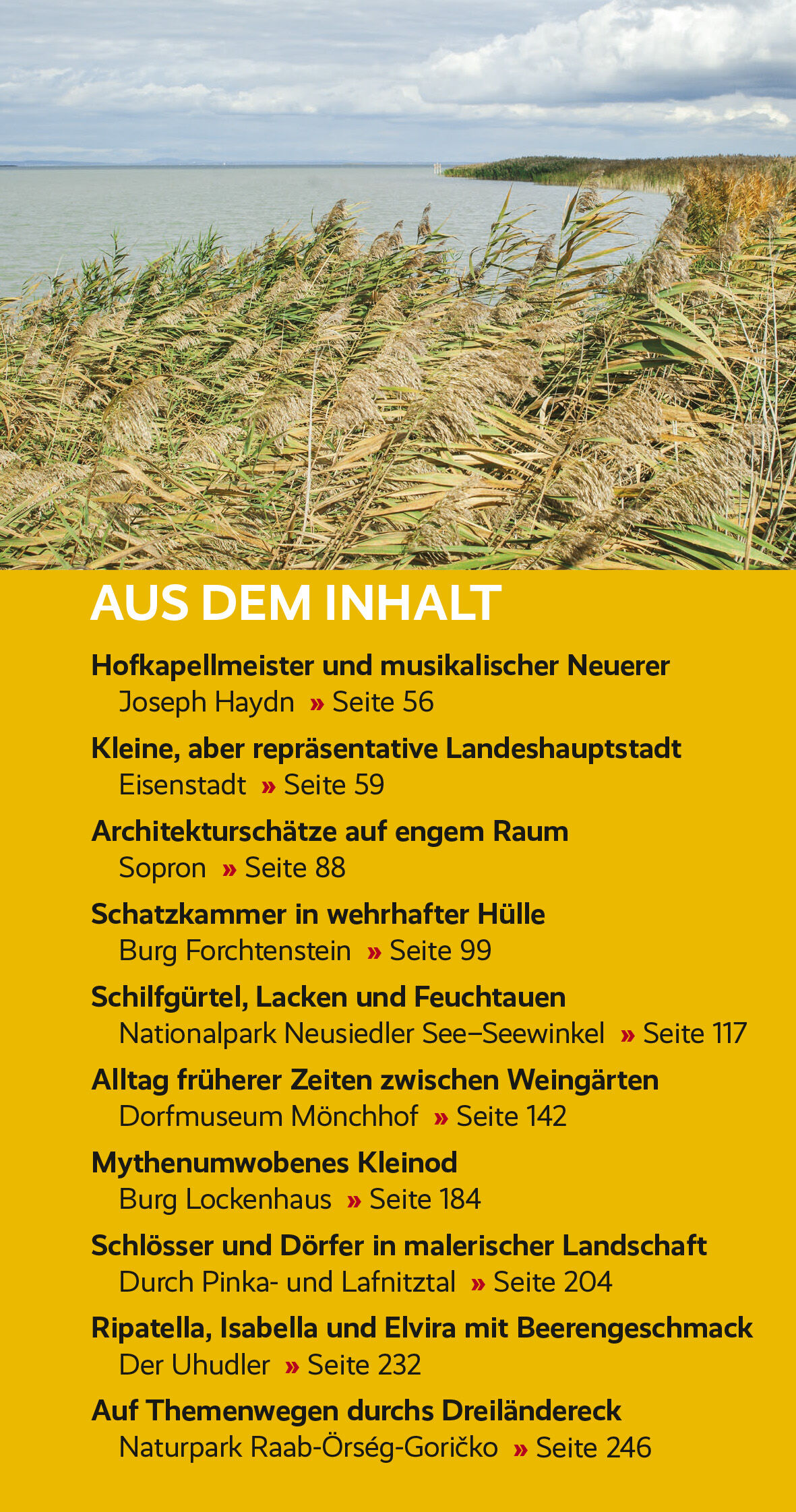 Endlose Schilfgürtel umziehen den Neusiedler See. Nur ein bis zwei Meter tief ist das riesige Steppengewässer und seine seltene Fauna und Flora als Weltnaturerbe geschützt. Weithin bekannt sind auch die Burgen und Schlösser im Land: darunter imposant Burg Forchtenstein, ein burgenländisches Wahrzeichen. Oder prunkvoll Schloss Esterházy in Eisenstadt: einst Wirkstätte von Joseph Haydn und Wiege der Wiener Klassik, heute Pilgerziel für Kultur- und Musikliebhaber.