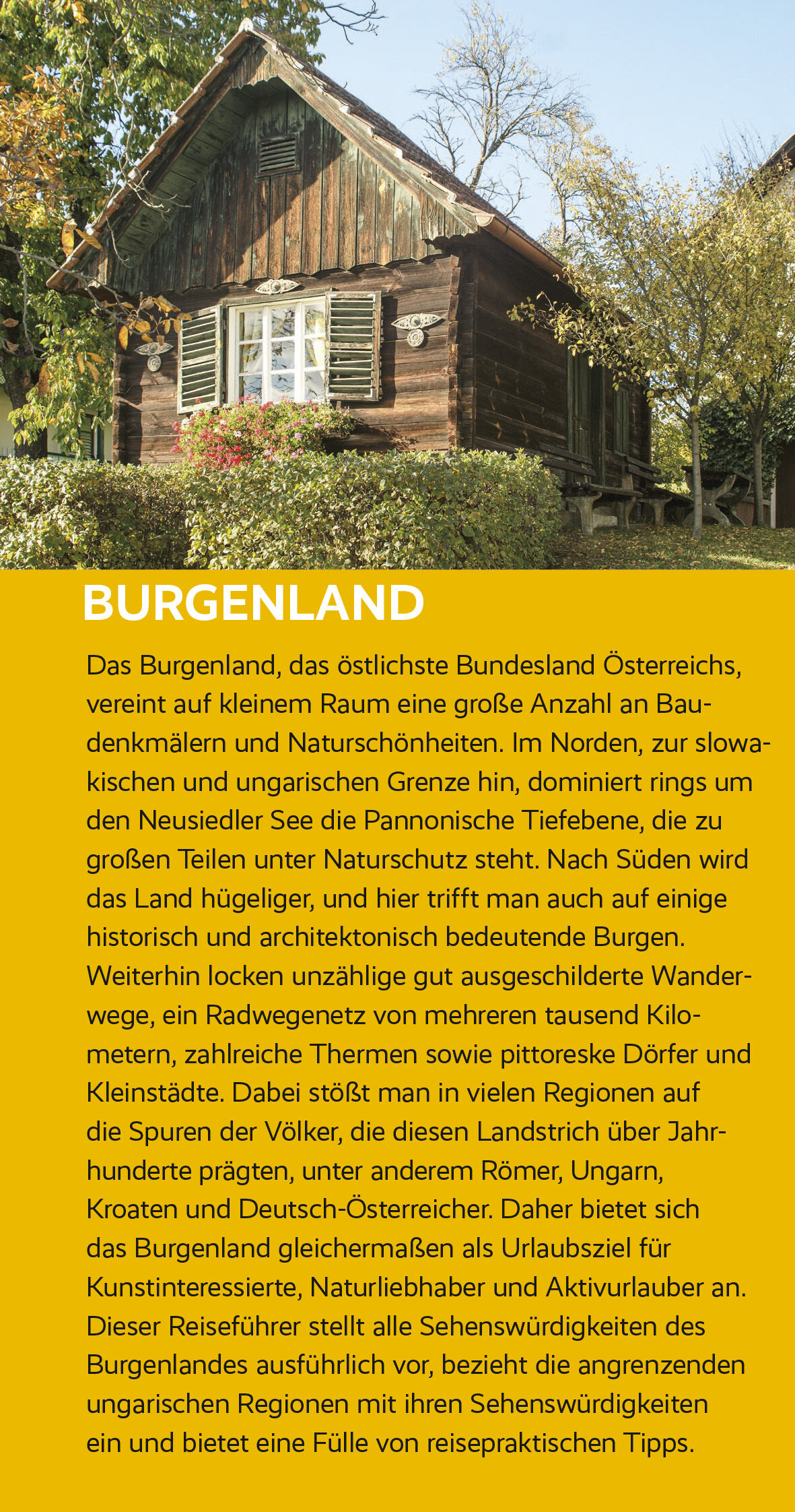 Österreichs sonnige Seite: Das Burgenland verzeichnet jährlich 300 strahlende Sonnentage. Vom Neusiedler See bis zur südlichen Weinidylle vereint es eine Fülle an Baudenkmälern und Naturschönheiten. Kunst und Kulinarik, Wandern und Radeln, Wellness und Wasser...Österreichs sonnige Seite: Das Burgenland verzeichnet jährlich 300 strahlende Sonnentage. Vom Neusiedler See bis zur südlichen Weinidylle vereint es eine Fülle an Baudenkmälern und Naturschönheiten. Kunst und Kulinarik, Wandern und Radeln, Wellness und Wassersport sorgen für einen geruhsamen Mix aus Kultur-, Natur- und Aktivurlaub. Der Trescher-Reiseführer BURGENLAND ist ideal für alle, die die Region umfassend entdecken möchten.