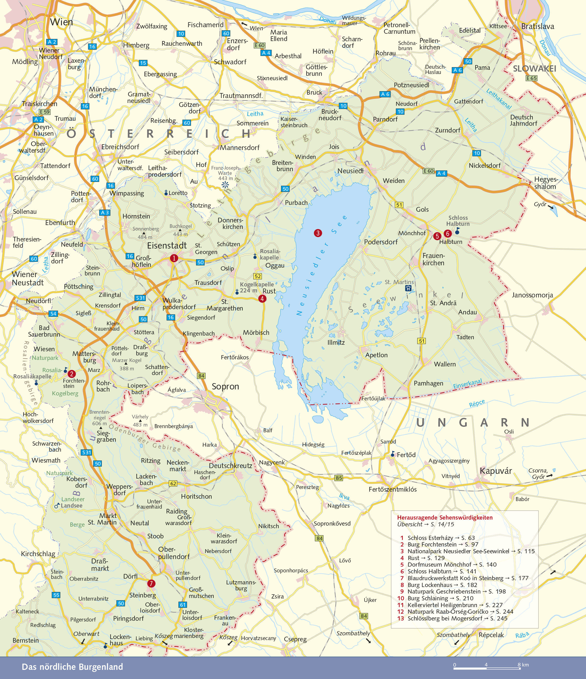 Österreich gilt als beliebtestes Urlaubsland der Deutschen und zählt überhaupt zu den meistbesuchten Urlaubsländern Europas. Die Gäste reisen nach Wien, in die Wachau, zu den Seen des Salzkammerguts oder Kärntens und im Winter zum Skifahren nach Tirol und in die Region um Salzburg. An vielen anderen Regionen Österreichs aber gehen die Besucherströme weitgehend vorbei. Dazu zählt auch das Burgenland, obwohl hier Kunstschätze und Naturschönheiten in großer Zahl eine Entdeckung lohnen.Das Burgenland nimmt innerhalb des heutigen Österreich eine Sonderstellung ein. Es gehörte, im Unterschied zu allen anderen österreichischen Bundesländern, rund 1000 Jahre lang zu einem anderen Staat: zu Ungarn. Diese Zugehörigkeit machte das Gebiet zu einer umkämpften Grenzregion, an deren Westsaum verlief die Grenze zwischen dem Heiligen Römischen Reich deutscher Nation und dem Territorium der ungarischen Könige. Kein Wunder, dass in diesem Gebiet neben den Ungarn und Österreichern ein großer Anteil verschiedener ethnischer Minderheiten ihre Heimat finden konnte: Kroaten, Walachen, Slowenen, Roma.Doch erst seit 1921 gibt es diese Region, als verwaltungstechnische Einheit, seitdem Burgenland genannt. Es wurde von den Siegermächten des Ersten Weltkrieges von Ungarn in einer willkürlichen Grenzziehung abgeschnitten und an Österreich angegliedert. Schon die Wahl des Namens ist eine Kuriosität. Er bezieht sich keineswegs auf Burgbauten oder Burgen im eigentlichen Sinn, sondern möchte ausdrücken, dass das Land ein Konglomerat von Teilen vier ehemaliger Komitate ist - wie im alten Ungarn die Verwaltungsbezirke hießen -, deren Verwaltungsstädte sämtlich auf -burg enden: Preßburg, Ödenburg, Eisenburg und Wieselburg. Doch keine dieser Komitatsstädte befand und befindet sich auf dem Territorium des neuen Landes! Diese Angliederung nahm nicht auf Geschichte, nicht auf vorhandene politische Strukturen oder das Leben der Bewohner Rücksicht. Daraus resultiert eine weitere Besonderheit, die ungewöhnliche äußere Form des Landes.Das Burgenland war auch das einzige Bundesland Österreichs, das nicht nur mit seinem Namen, sondern auch als definiertes Territorium in der NS-Zeit verschwand, da es zwischen dem Gau Niederdonau - dem vormaligen Land Niederösterreich - und der Steiermark aufgeteilt wurde. Und nach 1945, gerade neu entstanden, wurde das junge Gebilde erneut Grenzland, nun für 45 Jahre: Es lag am Eisernen Vorhang. Der aber wurde 1989 mit dem Durchschneiden der ungarischen Grenzanlagen durch österreichische und ungarische Minister hier geöffnet und letztlich zum Verschwinden gebracht. Das historische Grenzland Burgenland ist auch Grenzland in naturkundlicher Hinsicht: Es ist der Übergangsbereich der Alpen in die weite pannonische Ebene, die Grenze zwischen atlantischem Feucht- und pannonischem Trockenklima. Gerade das führte zu ganz eigenen geographischen Besonderheiten, die sonst nur in den Steppen Mittelasiens zu finden sind.Die meisten Touristen setzen 'Burgenland' mit dem Gebiet um den Neusiedler See gleich und ignorieren seine südliche Hälfte. Um das schöne Land mit seinen vielen Schätzen in seiner Gänze besser bekannt werden zu lassen und die Neugierde darauf zu wecken, entstand dieser Reiseführer.>>> Weitere Reiseführer zu Österreich finden Sie auf der Website des Trescher VerlagsInhalt