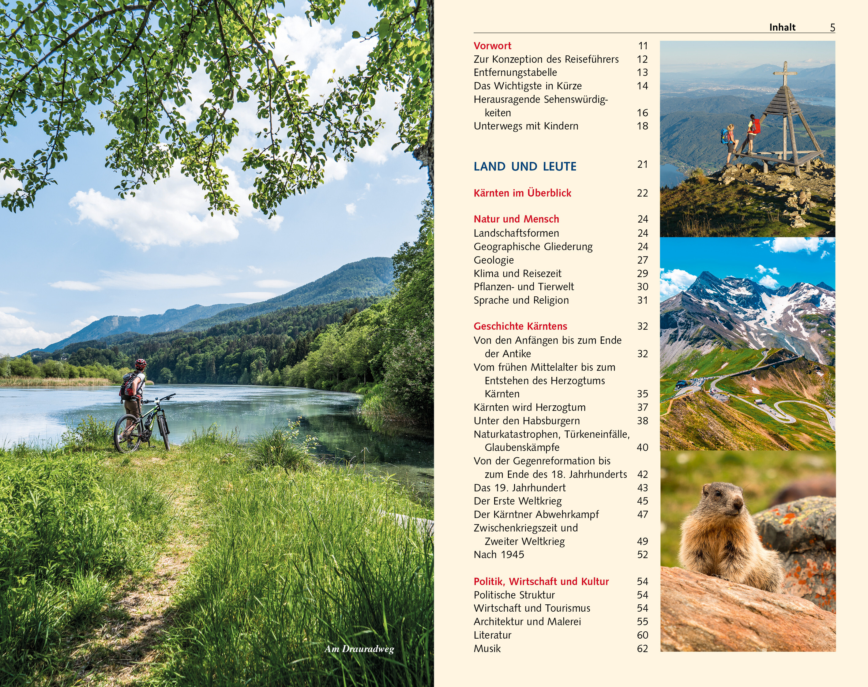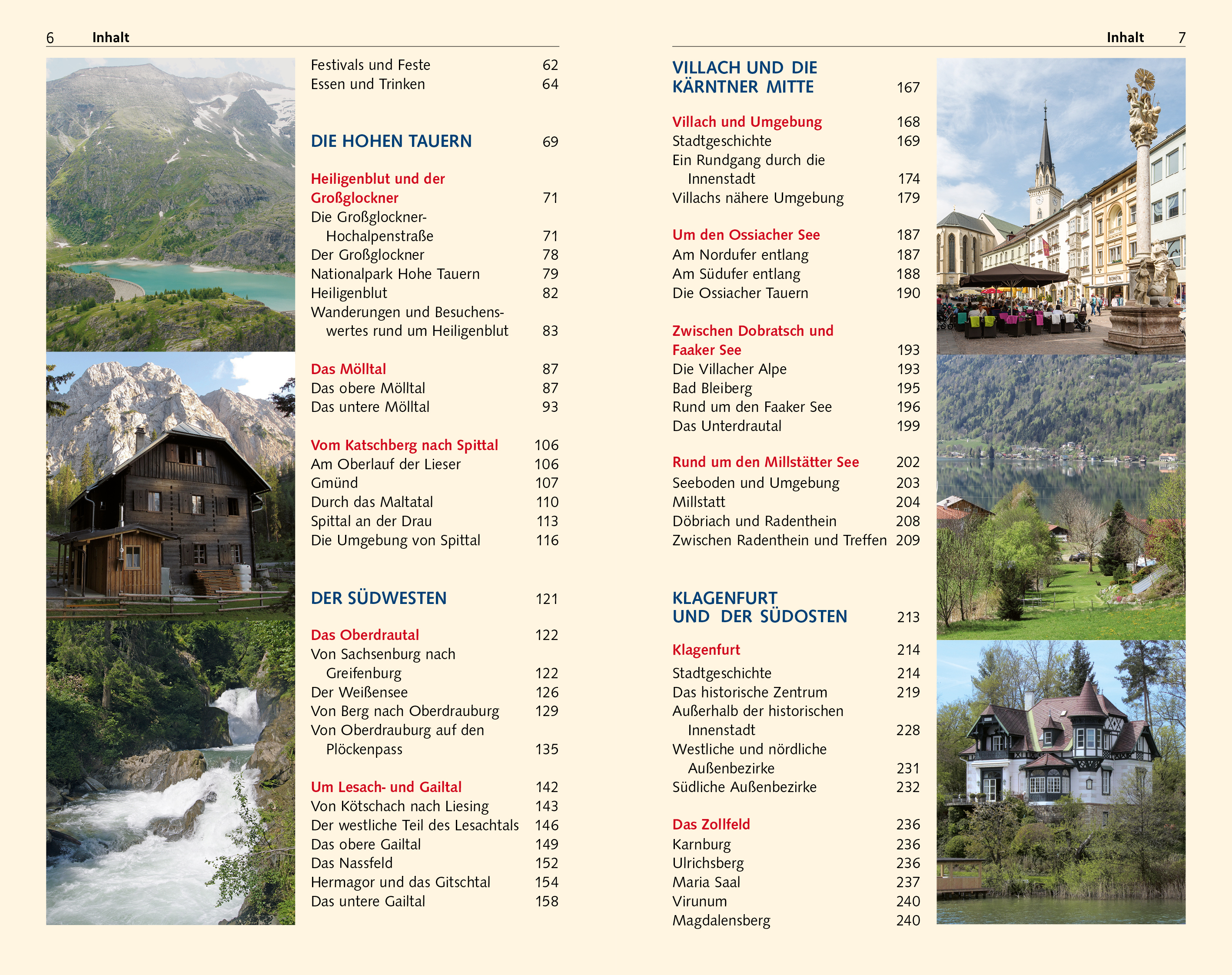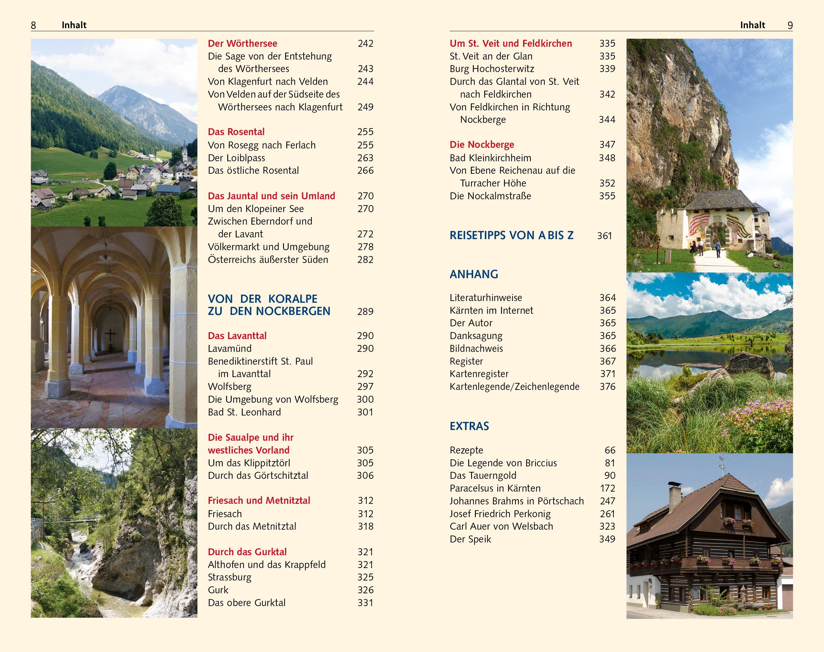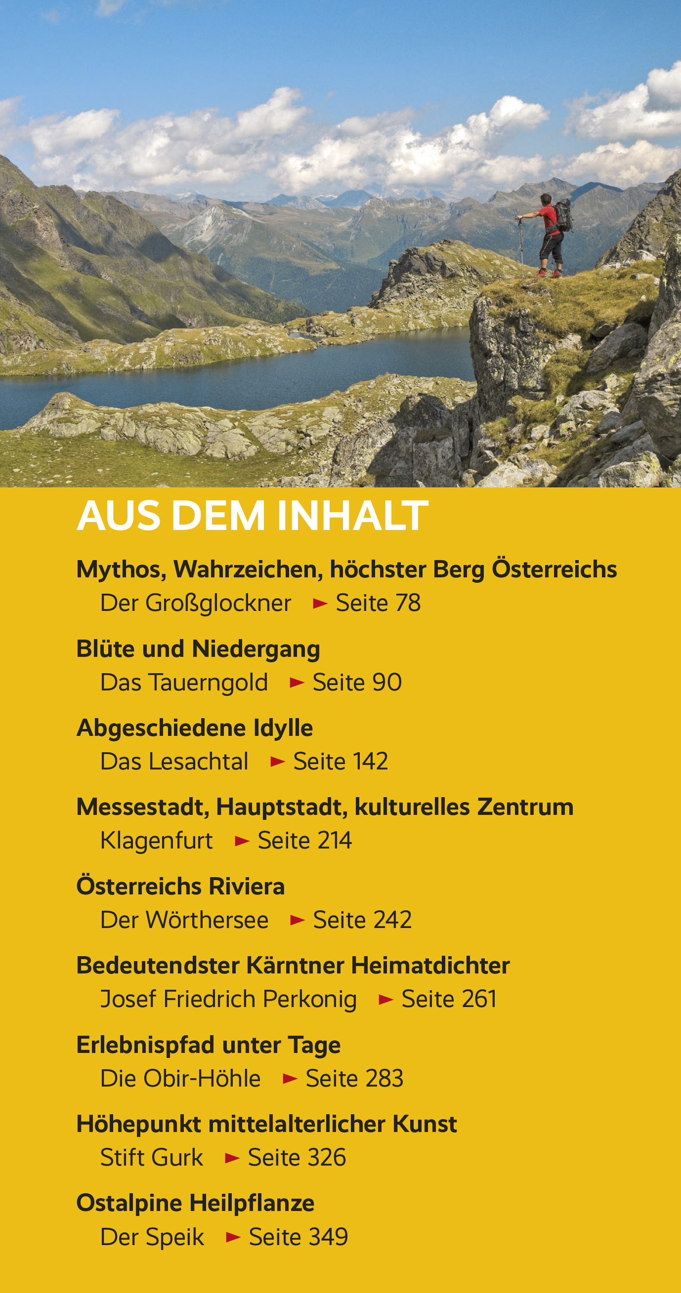 Seite 78 BLÜTE UND NIEDERGANG Das Tauerngold > Seite 90 ABGESCHIEDENE IDYLLE Das Lesachtal > Seite 142 MESSESTADT, HAUPTSTADT, KULTURELLES ZENTRUM Klagenfurt > Seite 214 ÖSTERREICHS RIVIERA Der Wörthersee > Seite 242 BEDEUTENDSTER KÄRNTNER HEIMATDICHTER Josef Friedrich Perkonig > Seite 261 ERLEBNISPFAD UNTER TAGE Die Obir-Höhle > Seite 283 HÖHEPUNKT MITTELALTERLICHER KUNST Stift Gurk > Seite 326 OSTALPINE HEILPFLANZE Der Speik > Seite 349 Kärnten, das südlichste österreichische Bundesland, besitzt die höchsten Alpengipfel des Landes und gleichzeitig in den niedrig gelegenen Landesteilen ein mediterran beeinflusstes Klima. Die Lage am Schnittpunkt von slawischen, romanischen und deutschösterreichischen Einflüssen zeigt sich nicht zuletzt in der hervorragenden Küche. Hauptattraktionen des Landes sind die großen Seen, unter denen der Wörthersee der bekannteste ist, und neben zahlreichen anderen Architekturschätzen die große Anzahl an Burgen und Wallfahrtskirchen. Die größeren Orte verzaubern mit ihren sorgfältig restaurierten historischen Zentren. Im Winter locken zahlreiche Pisten, im Sommer bieten die vielen Wanderwege und Flüsse beste Bedingungen für Wanderer und Wassersportler. Daher ist Kärnten als Urlaubsziel gleichermaßen für Natur- und Kultururlauber geeignet. Dieser Reiseführer stellt alle Regionen Kärntens mit allen ihren Sehenswürdigkeiten vor und gibt umfassende reisepraktische Tipps für Kultur- und Naturinteressierte sowie Aktivurlauber. >>> Weitere Reiseführer zu Österreich finden Sie auf der Website des Trescher VerlagsInhalt