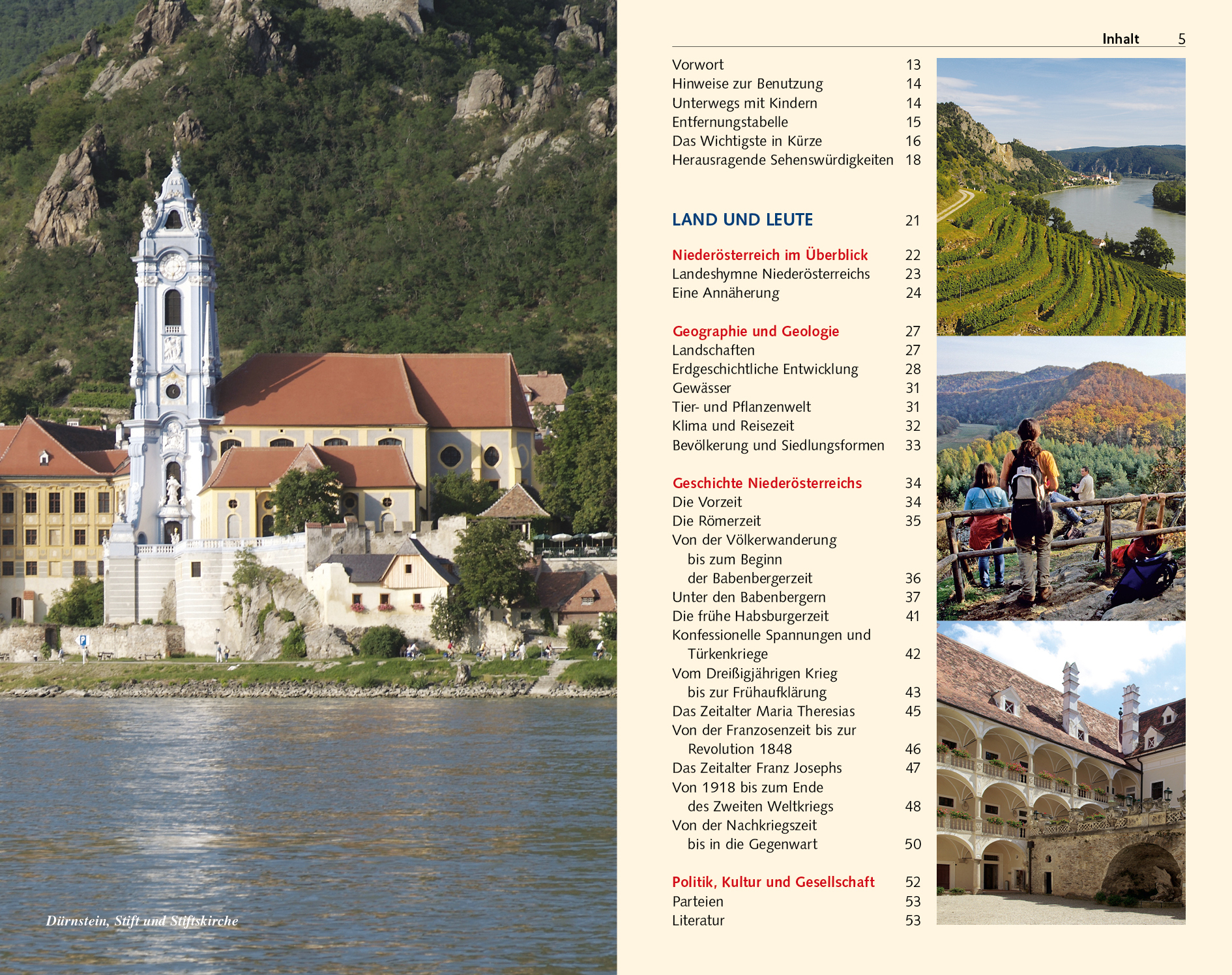 Vorwort 13 Hinweise zur Benutzung 14 Unterwegs mit Kindern 14 Entfernungstabelle 15 Das Wichtigste in Kürze 16 Herausragende Sehenswürdigkeiten 18 LAND UND LEUTE 21 Niederösterreich im Überblick 22 Landeshymne Niederösterreichs 23 Eine Annäherung 24 Geographie und Geologie 27 Landschaften 27 Erdgeschichtliche Entwicklung 28 Gewässer 31 Tier- und Pflanzenwelt 31 Klima und Reisezeit 32 Bevölkerung und Siedlungsformen 33 Geschichte Niederösterreichs 34 Die Vorzeit 34 Die Römerzeit 35 Von der Völkerwanderung bis zum Beginn der Babenbergerzeit 36 Unter den Babenbergern 37 Die frühe Habsburgerzeit 41 Konfessionelle Spannungen und Türkenkriege 42 Vom Dreißigjährigen Krieg bis zur Frühaufklärung 43 Das Zeitalter Maria Theresias 45 Von der Franzosenzeit bis zur Revolution 1848 46 Das Zeitalter Franz Josephs 47 Von 1918 bis zum Ende des Zweiten Weltkriegs 48 Von der Nachkriegszeit bis in die Gegenwart 50 Politik, Kultur und Gesellschaft 52 Parteien 53 Literatur 53 Film 55 Musik 55 Architektur und Bildende Kunst 56 Berühmte Niederösterreicher 59 Wichtige Festivals und Feste 60 Die niederösterreichische Küche 63 ENTLANG DER DONAU 69 Strudengau 70 Ardagger Markt und Ardagger Stift 70 Ybbs an der Donau 71 Persenbeug 71 Nibelungengau 73 Pöchlarn 73 Maria Taferl 74 Schloss Artstetten 75 Wachau und Dunkelsteiner Wald 80 Stift Melk 82 Stadt Melk 85 Um Schönbühel und Aggsbach 86 Aggstein 87 Am Jauerling 88 Spitz an der Donau 89 St. Michael 90 Weißenkirchen 91 Dürn…
