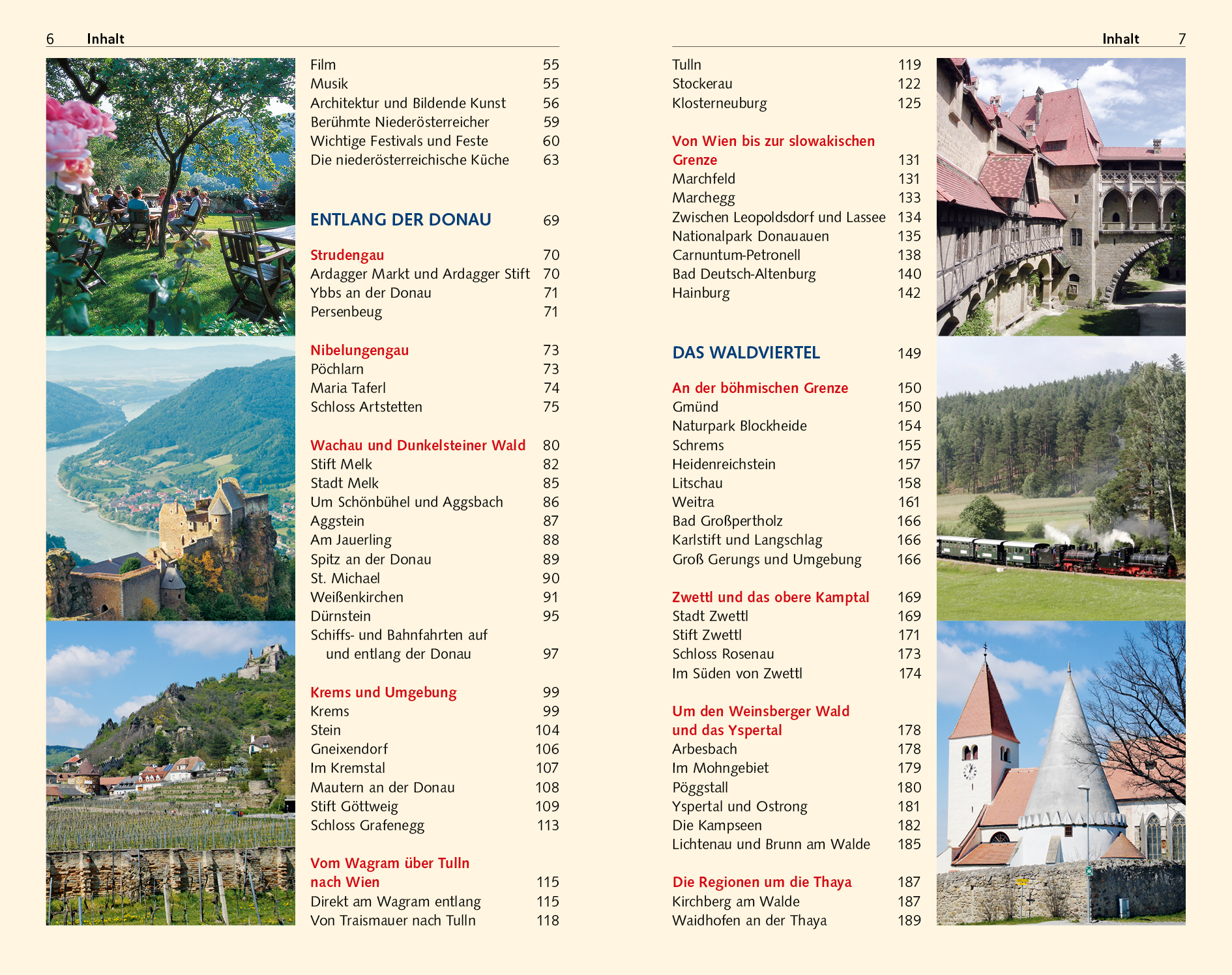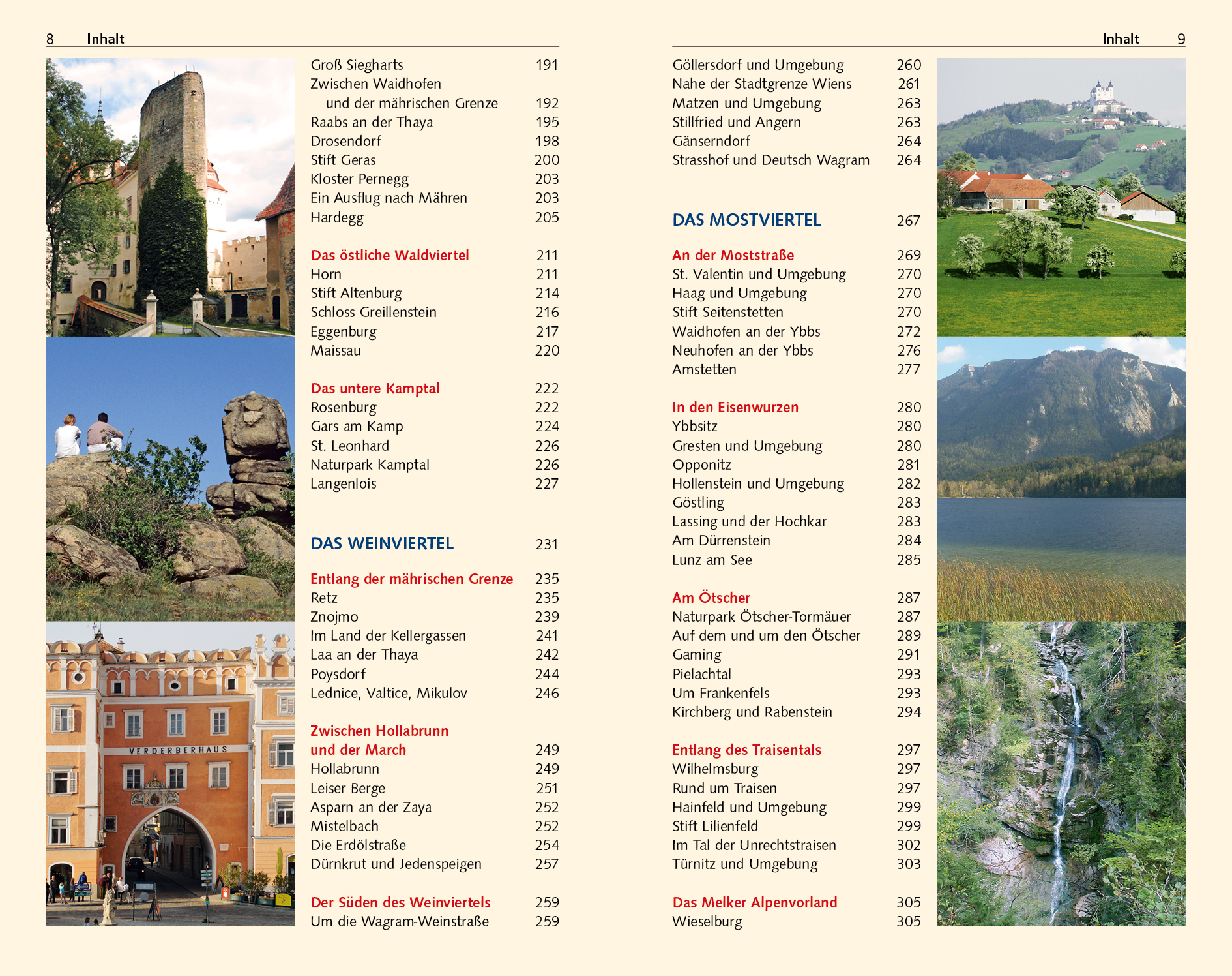 Seite 77 UNESCO-ERBE UND HEIMAT DER MARILLE Die Wachau > Seite 80 UNBERÜHRTE LANDSCHAFT UND SCHLÖSSERPRACHT Nationalpark Donauauen > Seite 135 GRENZÜBERSCHREITENDE TALLANDSCHAFT Nationalpark Thayatal > Seite 202 SCHÖNHEIT AN DER MÄHRISCHEN GRENZE Retz > Seite 235 DÖRFER OHNE RAUCHFANG Im Land der Kellergassen > Seite 241 MAJESTÄTISCHER NATURPARK Das Ötschermassiv > Seite 287 GRÖßTES MITTELALTERLICHES KLOSTER DES LANDES Stift Lilienfeld > Seite 299 NATUR UND KULTUR VOR DEN TOREN DER HAUPTSTADT Der Wienerwald > Seite 325 BURGEN, KIRCHEN, THEMENWEGE Die Bucklige Welt > Seite 374 Ausländische Touristen kennen von Niederösterreichs Sehenswürdigkeiten meist nur das malerische Donautal der Wachau mit seinen bedeutenden Klöstern und Burgen. Dabei stellt dieses österreichische Bundesland die wohl beeindruckendste Quintessenz dessen dar, was Österreich generell ausmacht: malerische Ortsbilder, Burgen und Dome, langgestreckte Bergketten und liebliche Ebenen, stille Auen und erhabene Ströme. Die Höhenzüge des Waldviertels, die von Weingärten bedeckten Hügel des Weinviertels, das abwechslungsreiche Mostviertel südlich der Donau und die schroffen Kalkmassive der Wiener Alpen bieten zahllose Urlaubsmöglichkeiten. Dieser Reiseführer stellt alle Regionen und alle Sehenswürdigkeiten Niederösterreichs ausführlich vor und liefert eine Fülle von Reisetipps. >>> Weitere Reiseführer zu Österreich finden Sie auf der Website des Trescher Verlags.