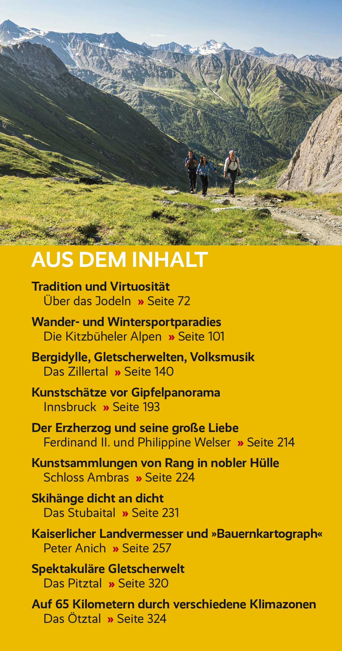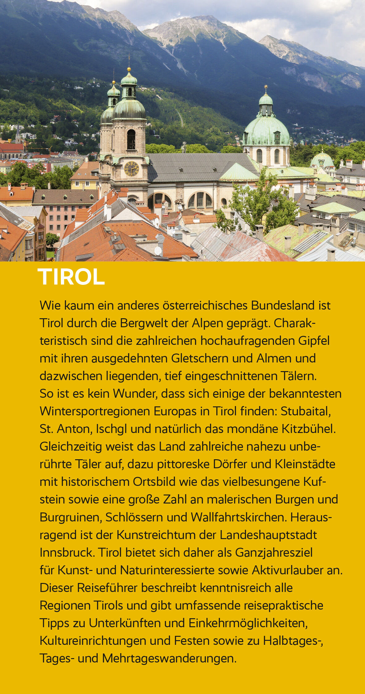 Pittoreske Kleinstädte wie Kufstein oder die alte Salz- und Münzstadt Hall zeugen von Tirols reicher Geschichte. Innsbruck vor den Zacken des Karwendelgebirges gleicht gar einem Gesamtkunstwerk. Mit der kaiserlichen Hofburg, dem Dom und der Hofkirche, zierreichen Bürgerhäusern und dem "Goldenen Dachl" als Wahrzeichen ist die Tiroler Landeshauptstadt einen ausgedehnten Aufenthalt wert. Ob Schloss Ambras, ob Museen, Klöster und Wallfahrtskirchen der ganze Reichtum Tirols wird von Autor Gunnar Strunz differenziert und detailreich beschrieben. Der Reiseleiter und intime Kenner der Alpenrepublik würdigt die Herzlichkeit der Tiroler und ihre lebendigen Traditionen. Und auch die Köstlichkeiten aus Küche und Keller kommen bei ihm nicht zu kurz.