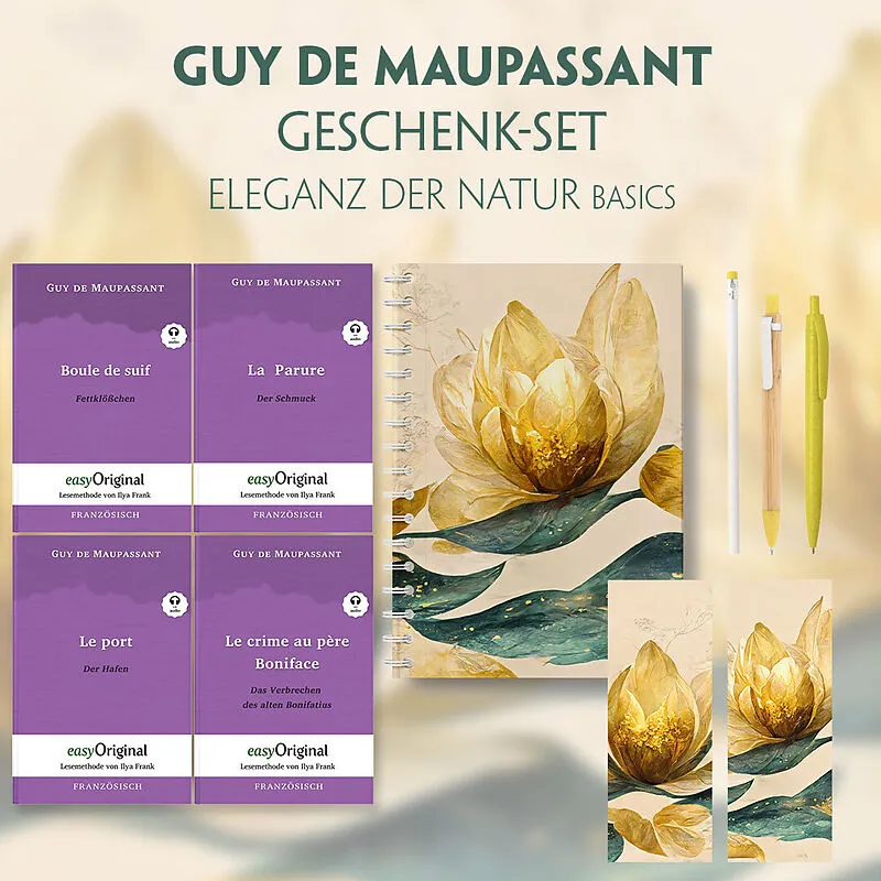 Guy de Maupassant Geschenkset - 4 Bücher (mit Audio-Online) + Eleganz der Natur Schreibset Basics