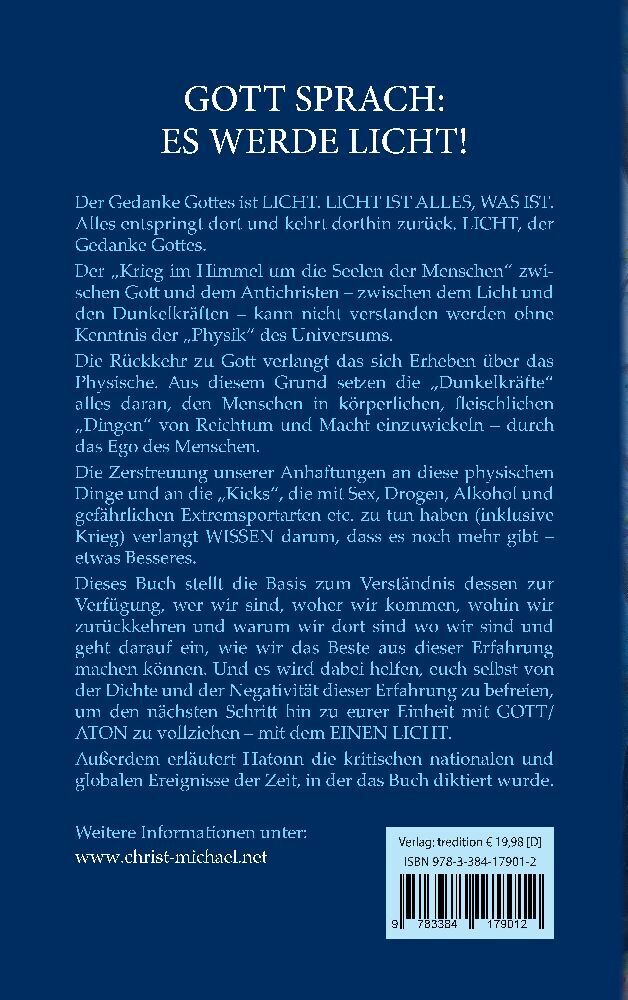 Im Titel des Buches heißt es ES WERDE LICHT! UND DIE SCHÖPFUNG ENTSTAND. Tatsächlich ist es das LICHT, welches der Urgrund allen Seins ist. Warum das so ist, beschreibt Hatonn ausführlich. Im Licht ruht der Same der Schöpfung. Im Licht liegt Sein und in der Sa...Im Titel des Buches heißt es ES WERDE LICHT! UND DIE SCHÖPFUNG ENTSTAND. Tatsächlich ist es das LICHT, welches der Urgrund allen Seins ist. Warum das so ist, beschreibt Hatonn ausführlich. Im Licht ruht der Same der Schöpfung. Im Licht liegt Sein und in der Saat der Wunsch zu sein. Und der Wunsch im Saatgut ist die Seele in der Saat, so Hatonn. Ohne Licht vergehen alle Dinge. Selbst in den größten Tiefen der Ozeane, wo das Leben stillzustehen scheint gibt es Leben, und daher MUSS es dort Licht geben. Denn so Hatonn weiter sämtliche Materie in diesem Universum ist nichts anderes als unterschiedlich konditionierte Bewegung, die Licht simuliert, und alle Unterschiede in der Beschaffenheit sind nur Druckunterschiede. Der Gedanke Gottes ist LICHT. LICHT IST ALLES, WAS IST. Alles entspringt dort und kehrt dorthin zurück. LICHT, der Gedanke Gottes. Der Krieg im Himmel um die Seelen der Menschen zwischen Gott und dem Antichristen zwischen dem Licht und den Dunkelkräften kann nicht verstanden werden ohne Kenntnis der Physik des Universums. Die Rückkehr zu Gott verlangt das sich Erheben über das Physische. Aus diesem Grund setzen die Dunkelkräfte alles daran, den Menschen in körperlichen, fleischlichen Dingen von Reichtum und Macht einzuwickeln durch das Ego des Menschen. Die Zerstreuung unserer Anhaftungen an diese physischen Dinge und an die Kicks, die mit Sex, Drogen, Alkohol und gefährlichen Extremsportarten etc. zu tun haben (inklusive Krieg) verlangt WISSEN darum, dass es noch mehr gibt etwas Besseres. Dieses Buch stellt die Basis zum Verständnis dessen zur Verfügung, wer wir sind, woher wir kommen, wohin wir zurückkehren und warum wir dort sind wo wir sind und geht darauf ein, wie wir das Beste aus dieser Erfahrung machen können. Und es wird dabei helfen, euch selbst von der Dichte und der Negativität dieser Erfahrung zu befreien, um den nächsten Schritt hin zu eurer Einheit mit GOTT/ ATON zu vollziehen mit dem EINEN LICHT. Denn unverzichtbar für die Rettung der Menschheit und unseres Planeten ist ein spiritueller Quantensprung, eine Befreiung unseres beschränkten Denkens und Wissens (welches uns zum Freiwild für satanische Eliten macht) hin zum erweiterten Bewusstsein um unsere innere Verbindung zu unserem Schöpfer. Deshalb gibt Hatonn neben den vielen Einblicken in die Strickmuster des Universums auch den Appell, dass wir die Illusionen unserer physischen Wahrnehmung transzendieren müssen. Denn unsere physischen Sinne betrügen uns. Materie ist nichts anderes als Bewegung und sie besitzt jenseits der Simulation von Realität keine echte Realität. Wir müssen die Augen und Ohren des Geistes öffnen, so Hatonn um das zu sehen und zu hören, was die physischen Augen und Ohren niemals sehen oder hören können, aber was ursächliche Wirklichkeit ist. Sind wir dazu endlich bereit und reif dafür? Außerdem erläutert Hatonn die kritischen nationalen und globalen Ereignisse der Zeit, in der das Buch diktiert wurde.