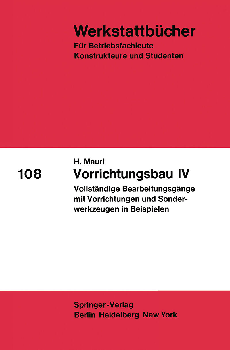 Mit diesem IV. Teil soll die Reihe "Vorrichtungsbau" innerhalb der "Werk stattbücher", bisher bestehend aus 1. Teil (Heft 33): Einteilung, Aufgaben und Elemente der Vorrichtungen, H. Teil (Heft 35) : Typische allgemein verwendbare Vorrichtungen (Konstruktive G...Mit diesem IV. Teil soll die Reihe "Vorrichtungsbau" innerhalb der "Werk stattbücher", bisher bestehend aus 1. Teil (Heft 33): Einteilung, Aufgaben und Elemente der Vorrichtungen, H. Teil (Heft 35) : Typische allgemein verwendbare Vorrichtungen (Konstruktive Grundsätze, Beispiele, Fehler), IH. Teil (Heft 42): Wirtschaftliche Herstellung und Ausnutzung der Vorrichtungen, abgeschlossen werdenI. Die bei der Konstruktion von Vorrichtungen zu berücksichtigenden vielfältigen Umstände, wie Anlieferungszustand, Gleichmäßigkeit, Maßhaltigkeit, Werkstoff beschaffenheit, Zerspanungsmenge und Stückzahl der Werkstücke sowie Art und Anzahl der einsatzbereiten Werkzeugmaschinen, sind bei \Verkstücken ähnlicher Art nicht immer einheitlich. Sie geben den Vorrichtungen oft solche Eigenarten, daß diese nicht immer als Vorbilder für vergleichbare Werkstücke dienen können. Was in dem einem Fall richtig und zweckmäßig sein mag, kann in einem anderen Fall durchaus falsch sein. Um aber den jeweiligen Zweck zu erreichen, nämlich die besonderen Eigenheiten und die Wirkungsweise der Vorrichtungen besser verstehen und auch praktischen Nutzen aus ihnen ziehen zu können, werden in diesem IV. Teil Beispiele vollständiger Bearbeitungsgänge für die Reihen fertigung von mehr oder minder typischen Werkstücken beschrieben. Die dafür benötigten Vorrichtungen, Sonderwerkzeuge usw. werden diskutiert und, wo erforderlich, auch die besonderen Umstände erläutert, die zu den in den Beispie len angeführten zweckmäßigsten Arbeitsabläufen und den davon abhängigen, für die einzelnen Arbeitsstufen besten Lösungen der betreffenden Vorrichtungs konstruktionen geführt haben. Möge auch dieses neue Buch ebenso wie bereits seine drei Vorgänger dem Vor richtungskonstrukteurund dem Fertigungsfachmann noch manche Hinweise und Anregungen geben und vor allem den Studierenden für das Fachgebiet Ferti gungstechnik zuverlässiger Ratgeber und Leitfaden sein.