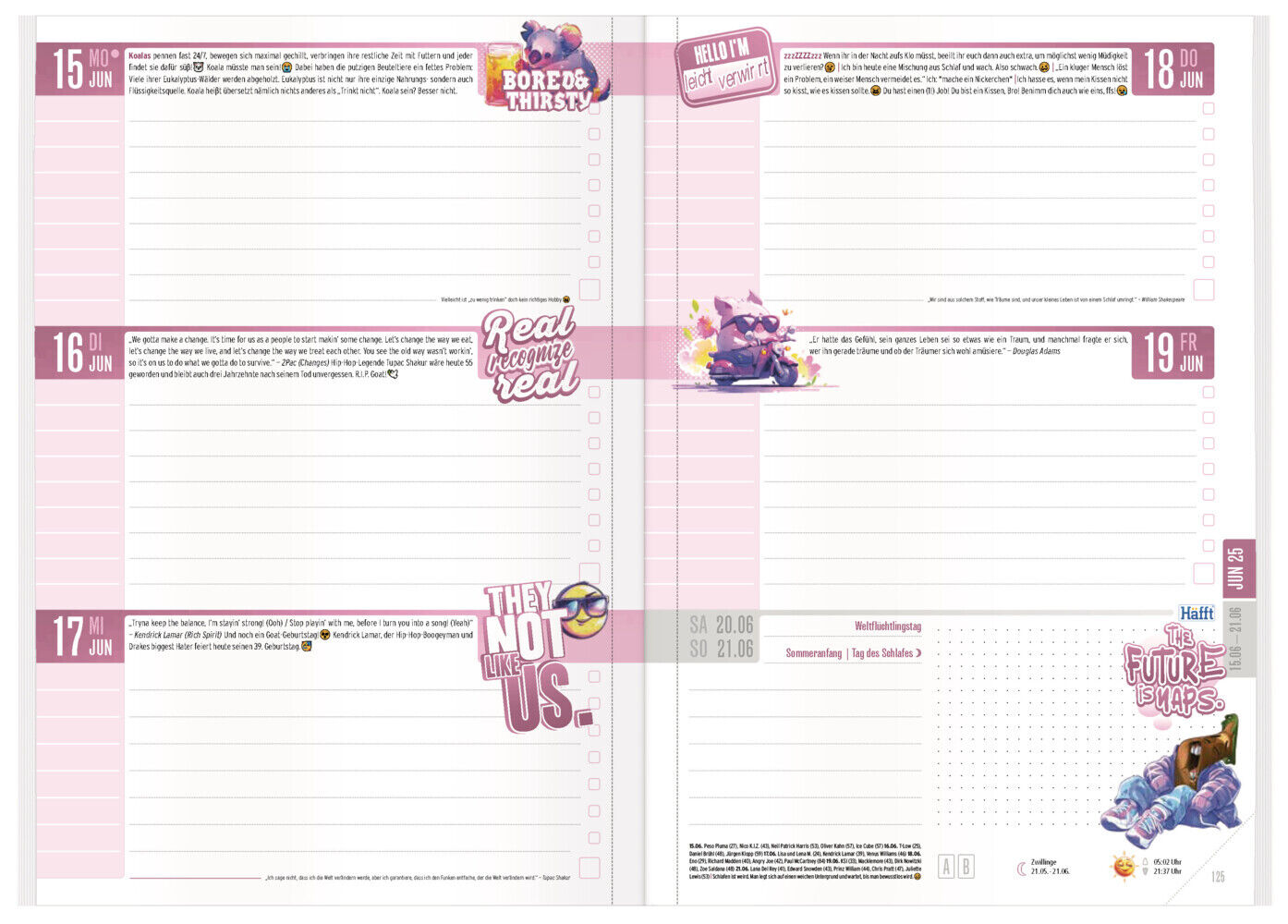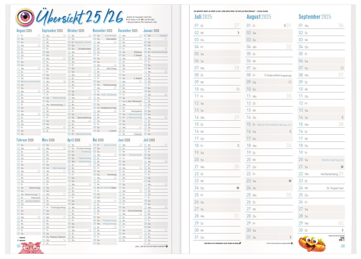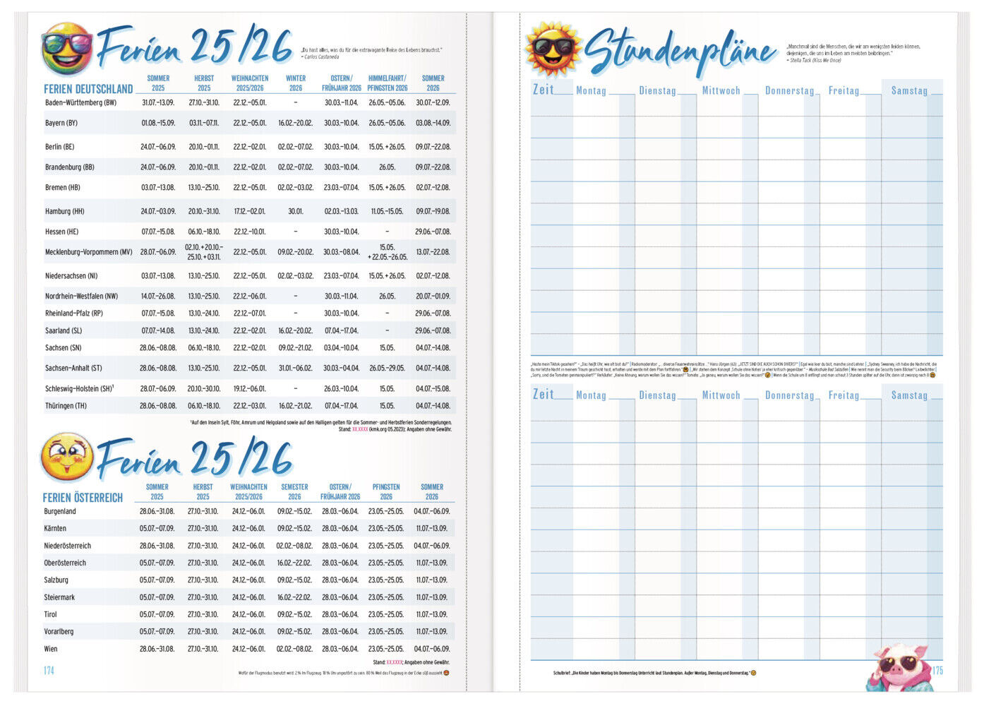 Kultiges Hausaufgabenheft für das Schuljahr 25/26, mit zahlreichen praktischen Sonderseiten und der Extraportion Spaß, Hilfen zum Organisieren, Schulwissen, Infos und Übersichten, dazu Gags und Cartoons, Sprüche, Fun Facts und witzige Stories, Format A5, 176 S...