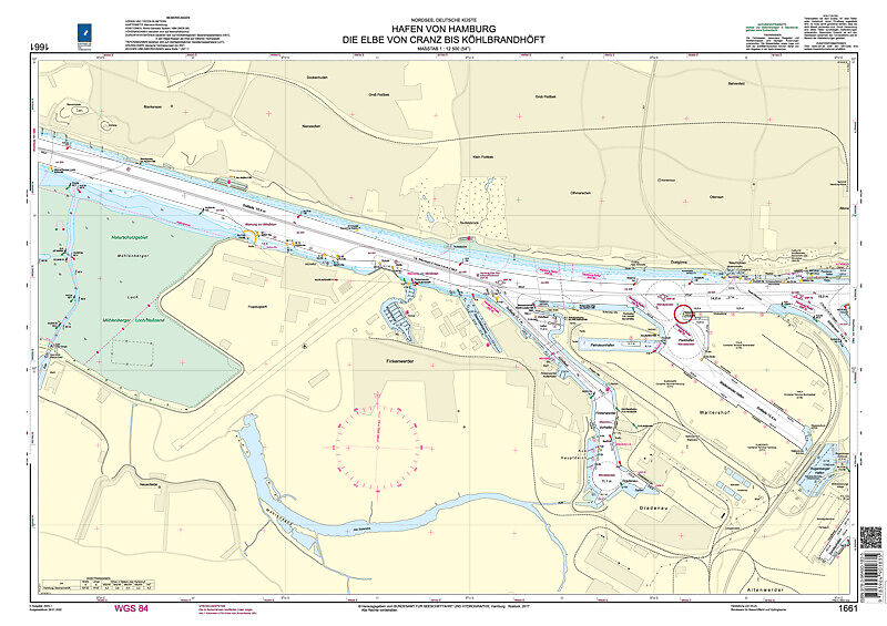 Amtliche deutsche Seekarte des Bundesamtes für Seeschifffahrt und Hydrographie für den Bereich der Elbe und des Hafens von Hamburg.