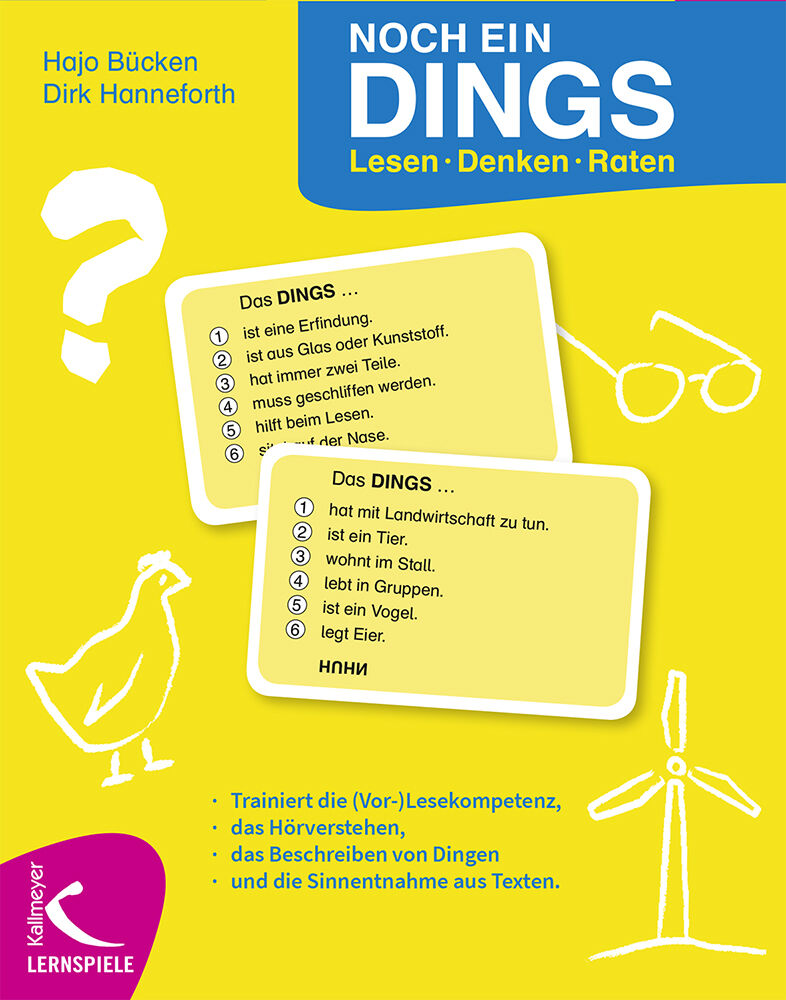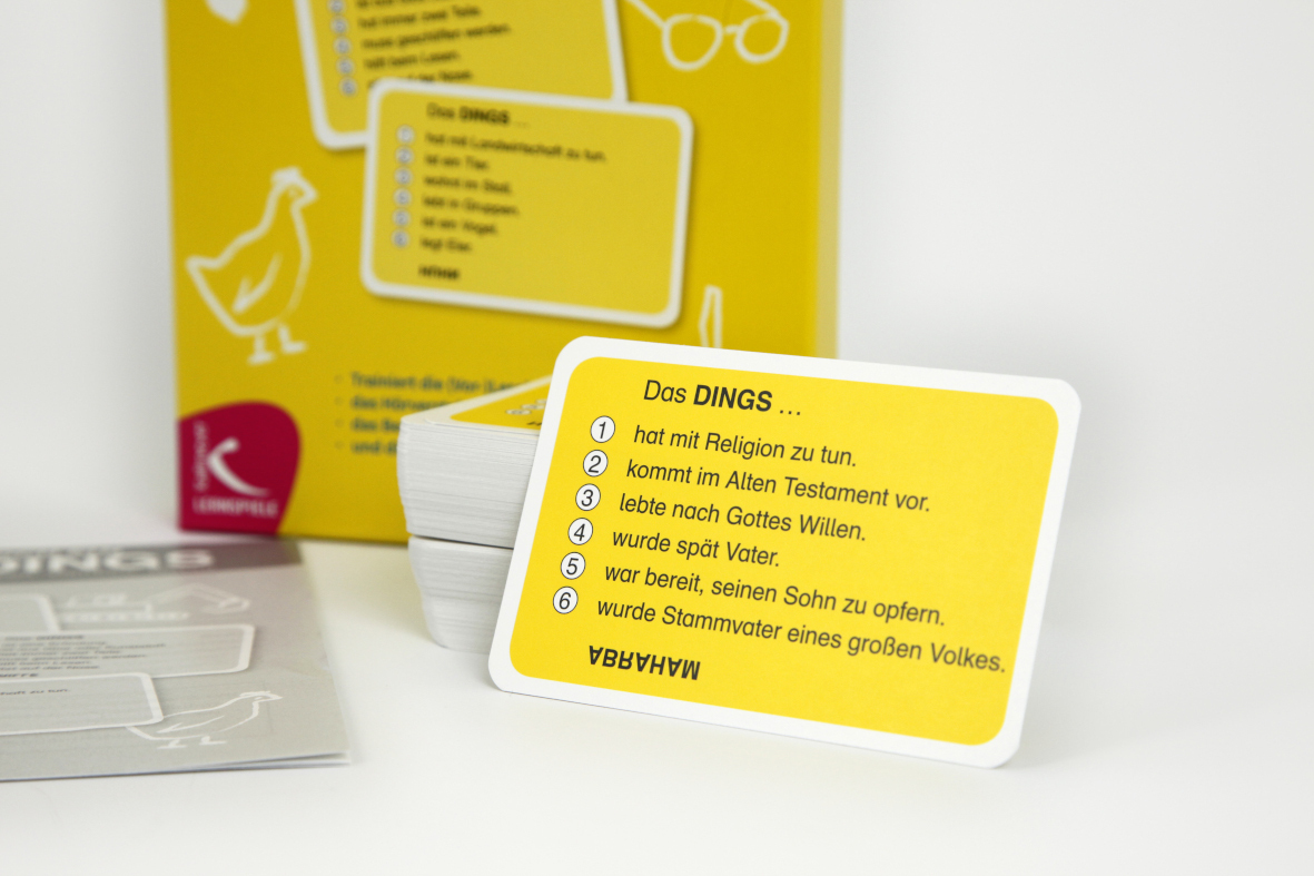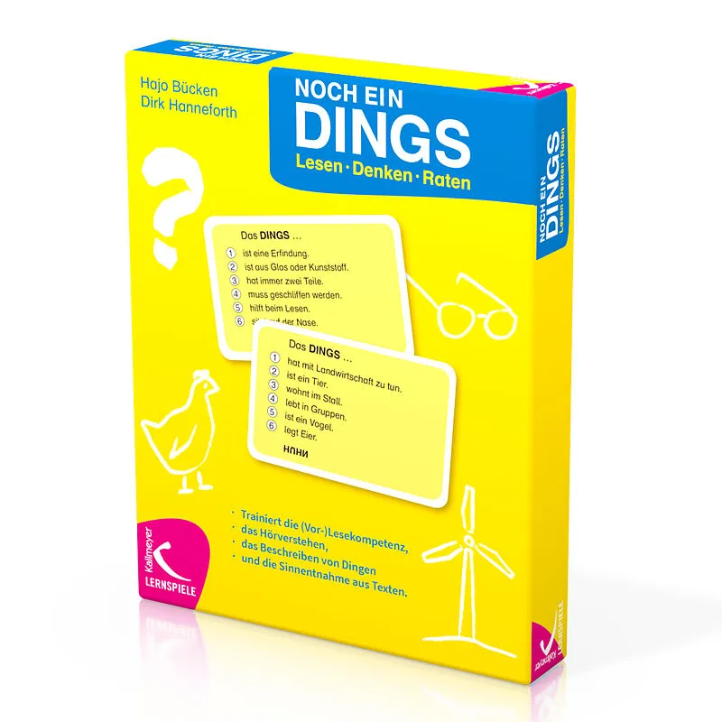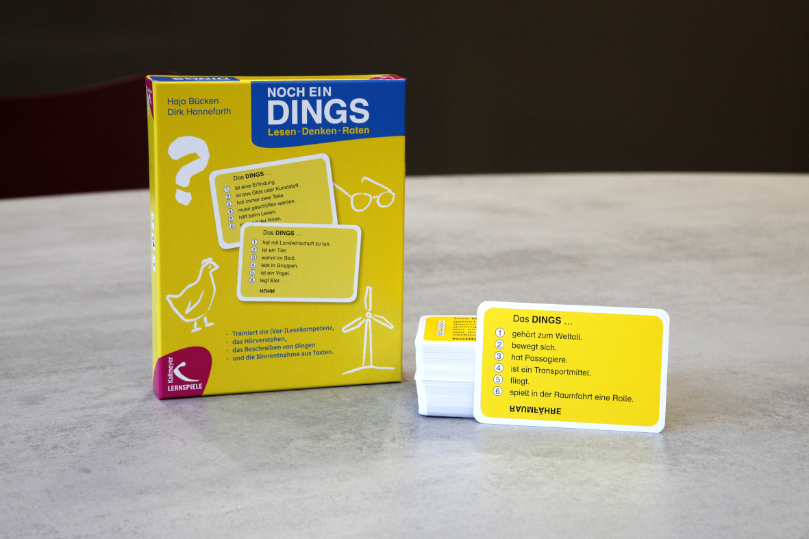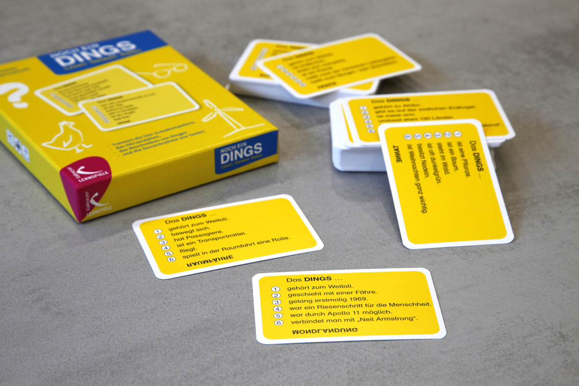 NOCH EIN DINGS ist ein kommunikatives Ratespiel, das (Vor-)Lesen und Zuhören trainiert.
