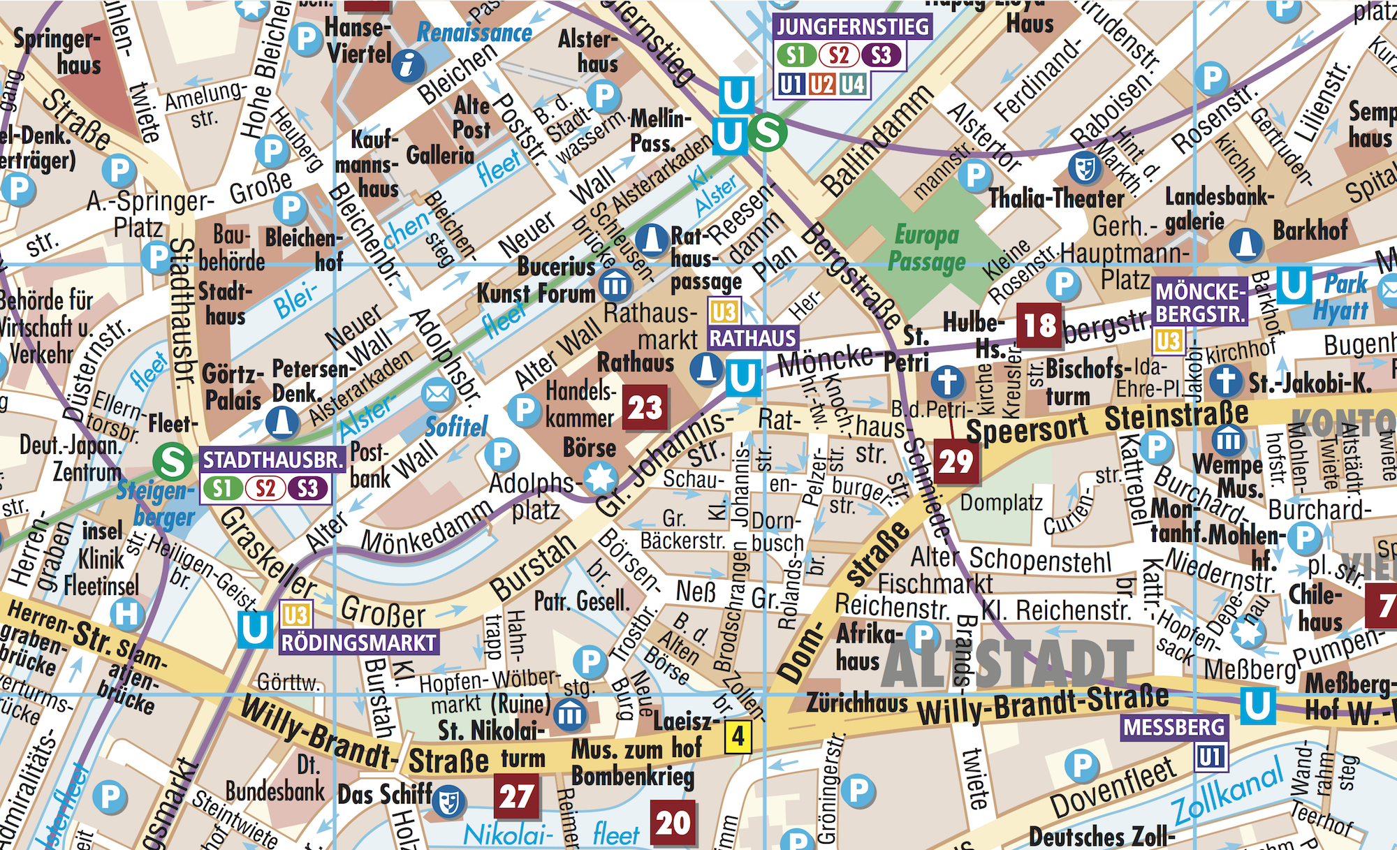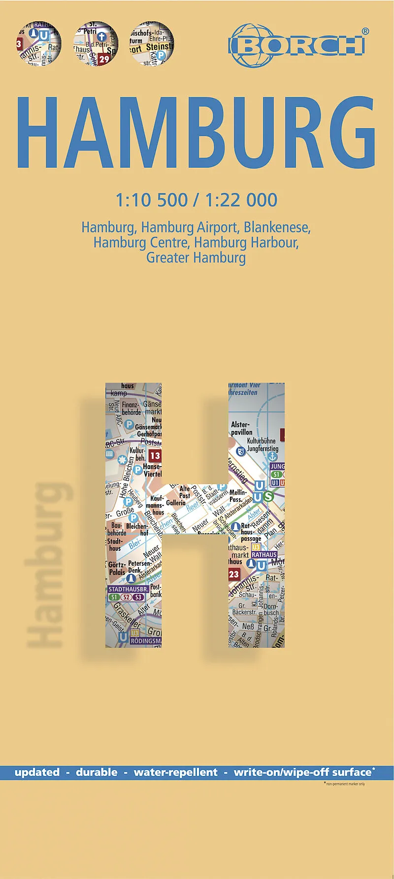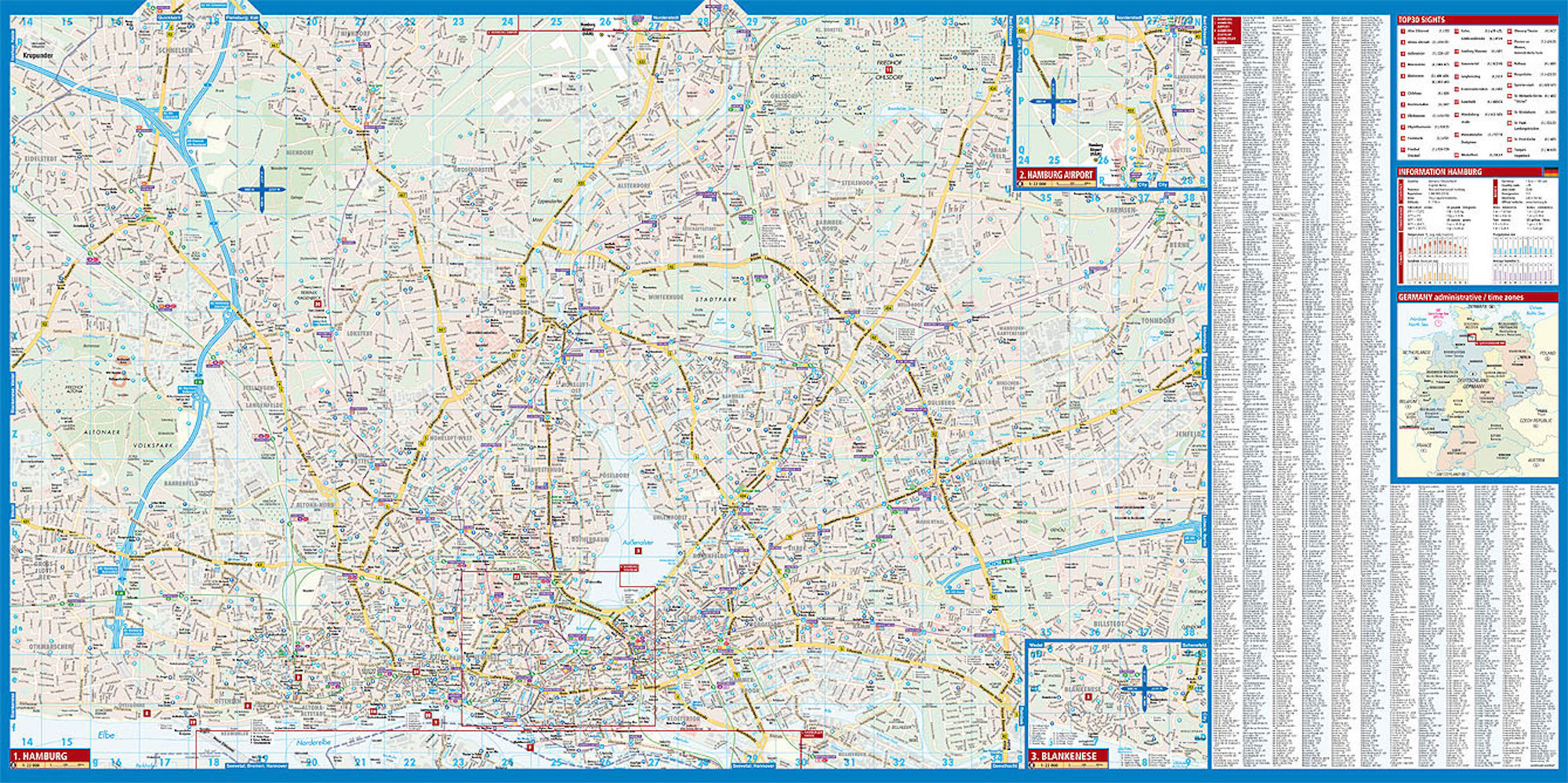 Einzelkarten: Hamburg 1:22 000, Hamburg Zentrum 1:10 500, Blankenese 1:22 000, Hamburg Flughafen 1:22 000, Hamburger Hafen 1:25 000, Großraum Hamburg 1:130 000, Nahverkehrskarte HVV, Germany administrative & time zone Format: 494 mm x 990 mm Unsere folienb...