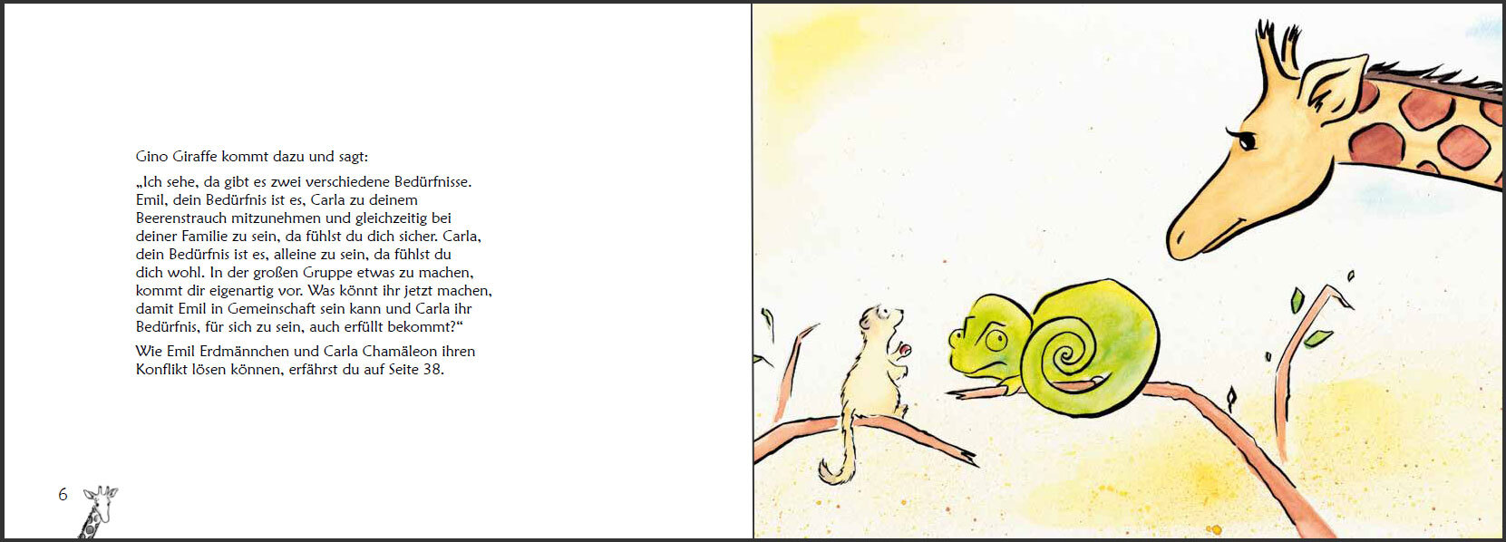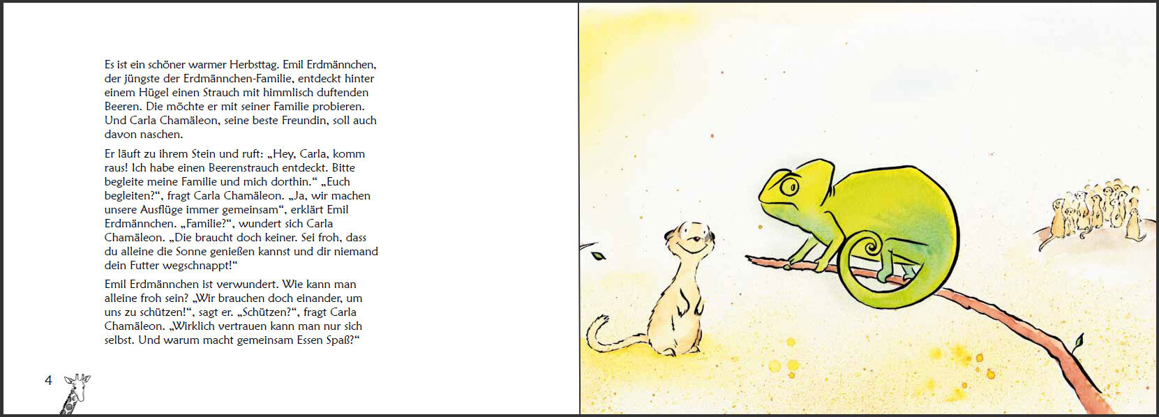 Das illustrierte Kinderbuch zur Gewaltfreien Kommunikation Emil Erdmännchen möchte mit seiner Familie und seiner Freundin Carla Chamäleon einen Ausflug zum himmlisch duftenden Beerenstrauch machen. Doch Carla Chamäleon hat keine Lust, und Emil Erdmännchen ver...