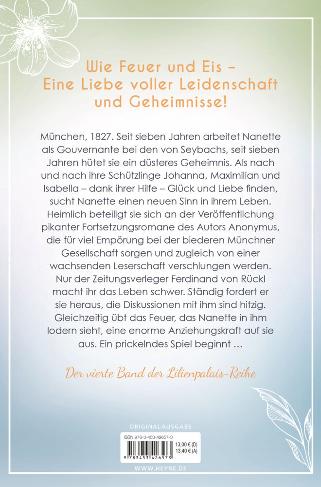 Wie Feuer und Eis Eine Liebe voller Leidenschaft und Geheimnisse München, 1827. Seit sieben Jahren arbeitet Nanette als Gouvernante bei den von Seybachs, seit sieben Jahren hütet sie ein düsteres Geheimnis. Als nach und nach ihre Schützlinge Johanna, Maximilia...
