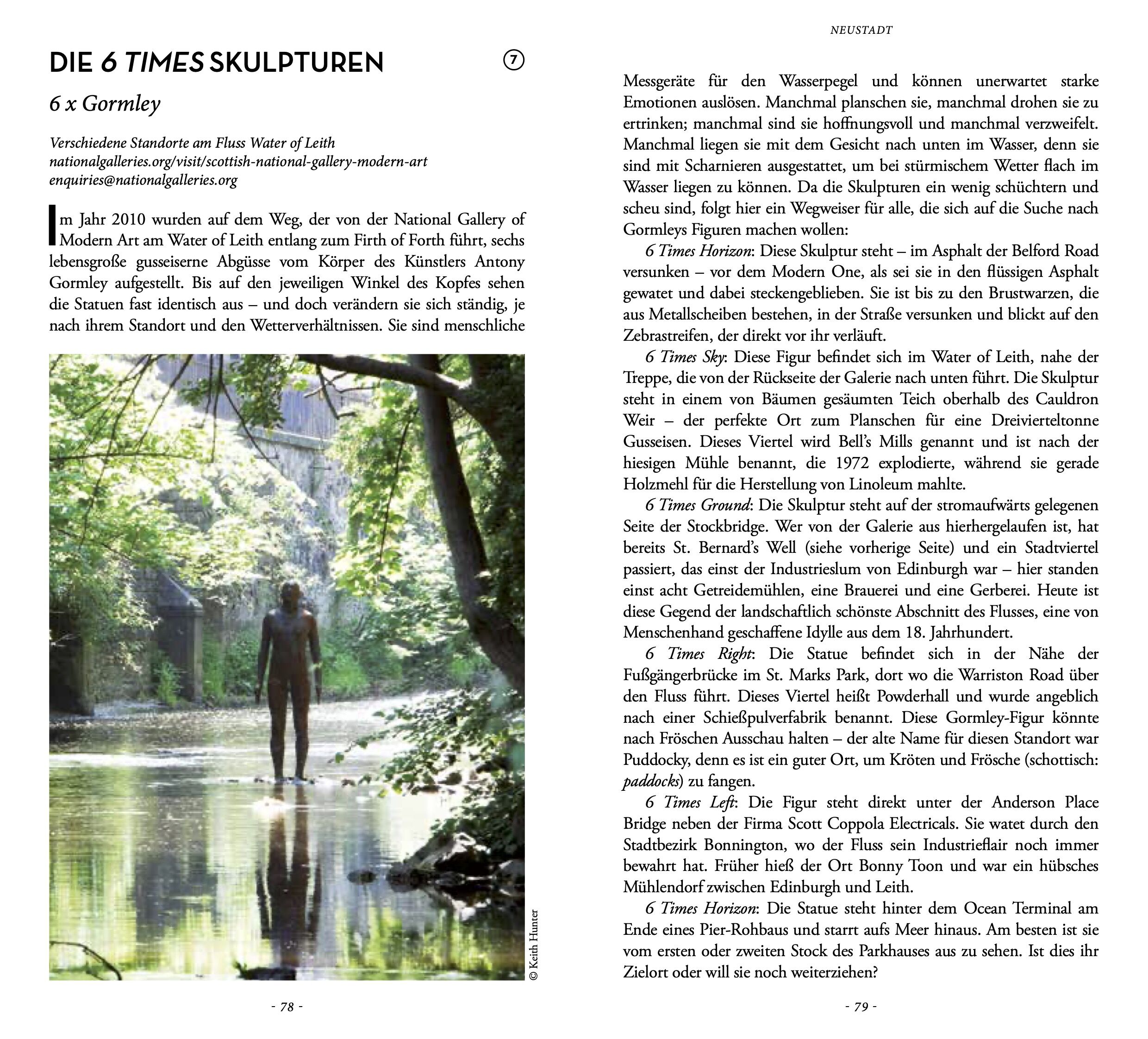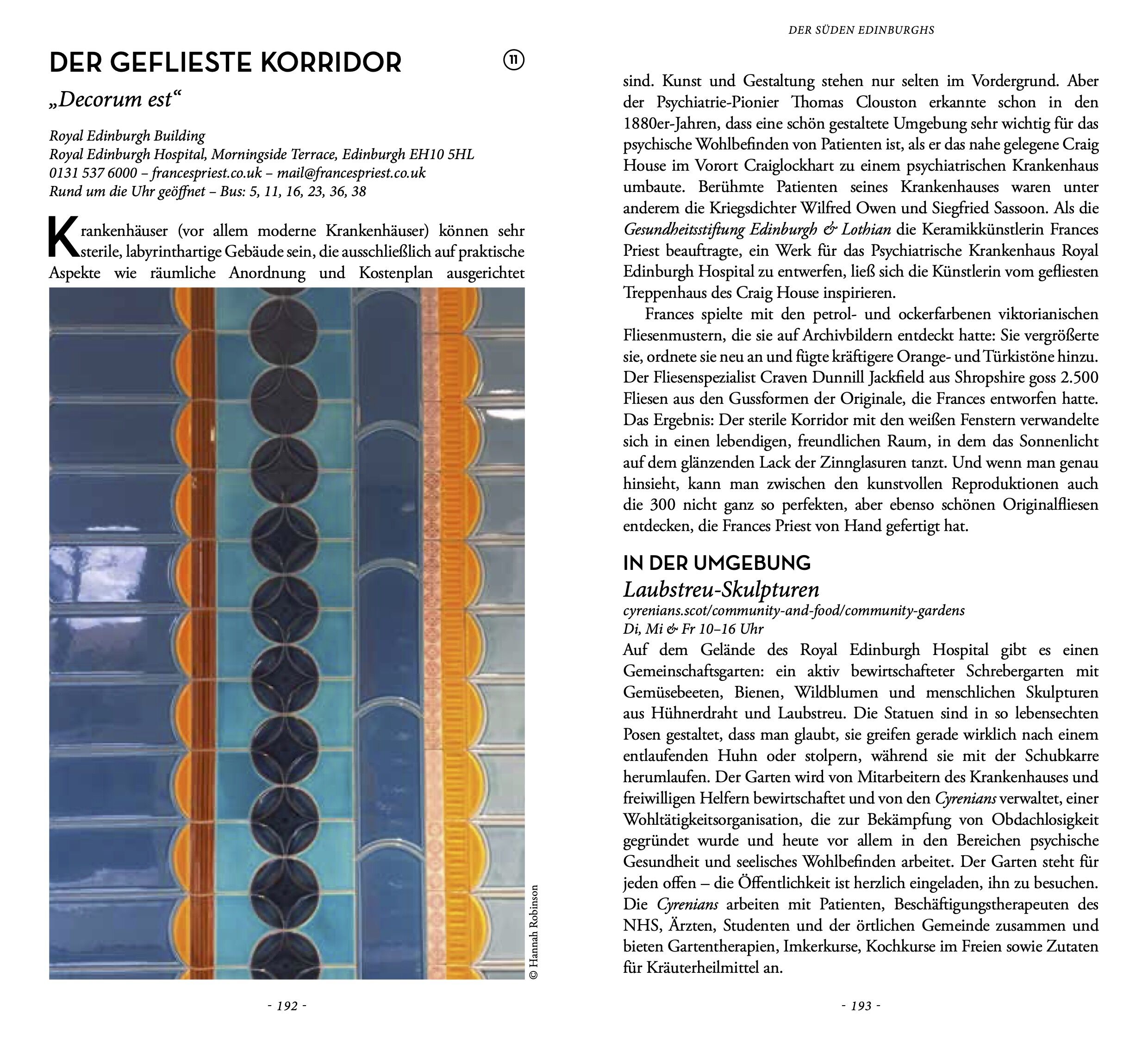 In einen Bunker aus dem Kalten Krieg hinabsteigen, Guerilla-Mosaike zusammensetzen, die prachtvollsten Grotten entdecken, vor dem hölzernen Roboterherrscher niederknien, Hunde aufspüren, die bezaubernder sind als der berühmte Greyfriars Bobby, eine Auflistung von Liebesdamen aus dem 17. Jahrhundert studieren, eine Wasserfolter im Prototyp eines Whirlpools genießen, in den Wilden Westen von Morningside reisen, versteckte Gärten und verborgene Kunstwerke entdecken, die nicht einmal die umliegende Nachbarschaft kennt!