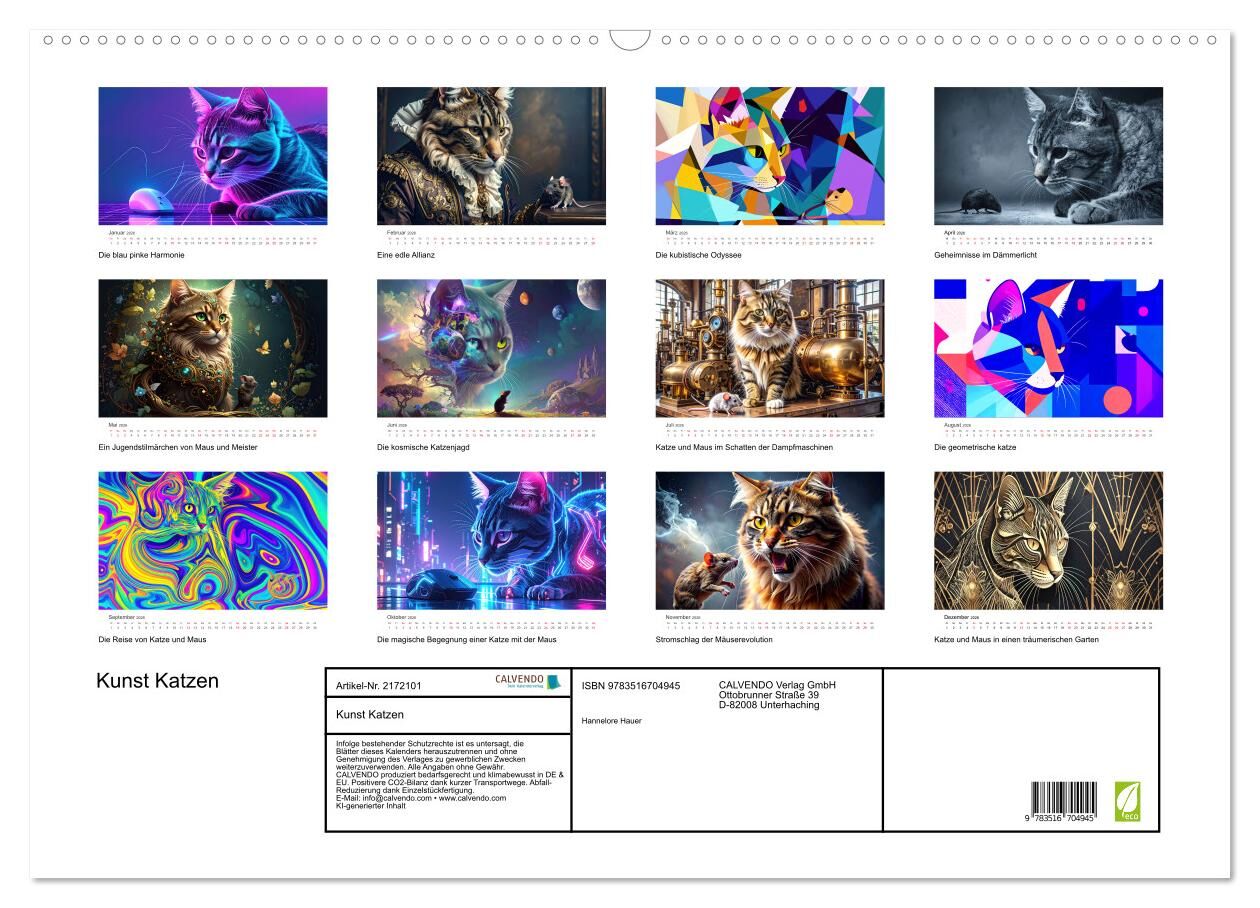 Dieser außergewöhnliche Kalender vereint die majestätische Eleganz der Katze mit der faszinierenden Vielfalt der Kunstgeschichte. Monat für Monat präsentieren sich Katzen in eindrucksvoll von KI erschaffenen Szenen inspiriert von den großen Kunstepochen der Me...