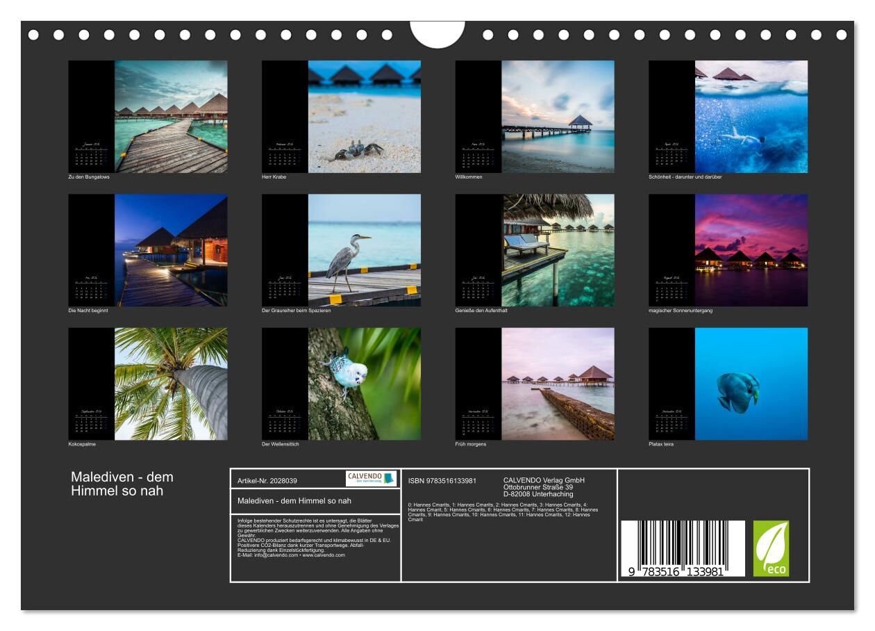 12 meisterliche Fotografien zeigen die Schönheit der himmlischen Malediven und deren Fauna. Sowohl die paradiesischen Inseln, als auch die atemberaubende Unterwasserwelt werden abgebildet. Lassen Sie sich durch die Aufnahmen verwöhnen.