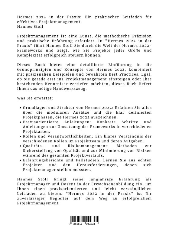 Hermes 2022 in der Praxis: Ein praktischer Leitfaden für effektives Projektmanagement Hannes Stoll Projektmanagement ist eine Kunst, die methodische Präzision und praktische Erfahrung erfordert. In "Hermes 2022 in der Praxis" führt Hannes Stoll Sie durch die W...