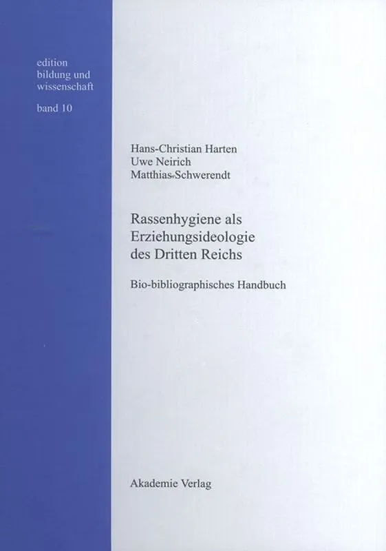 In der primär wissenschaftsgeschichtlich ausgerichteten Untersuchung von Harten, Neirich und Schwerendt werden diese Aspekte und Zusammenhänge erstmals dargestellt und mit empirischem Datenmaterial belegt. Ergänzt wird die Arbeit durch biographische und sozialisationsgeschichtliche Untersuchungen zu den Autoren der in der Bibliographie zusammengestellten Schriften. Dabei wird insbesondere das Bild einer historisch bedeutsamen Gruppe von "Mediatoren" zwischen Wissenschaft und Praxis sichtbar, ohne die die Umsetzung der rassenhygienischen Ziele im Nationalsozialismus kaum denkbar gewesen wäre.