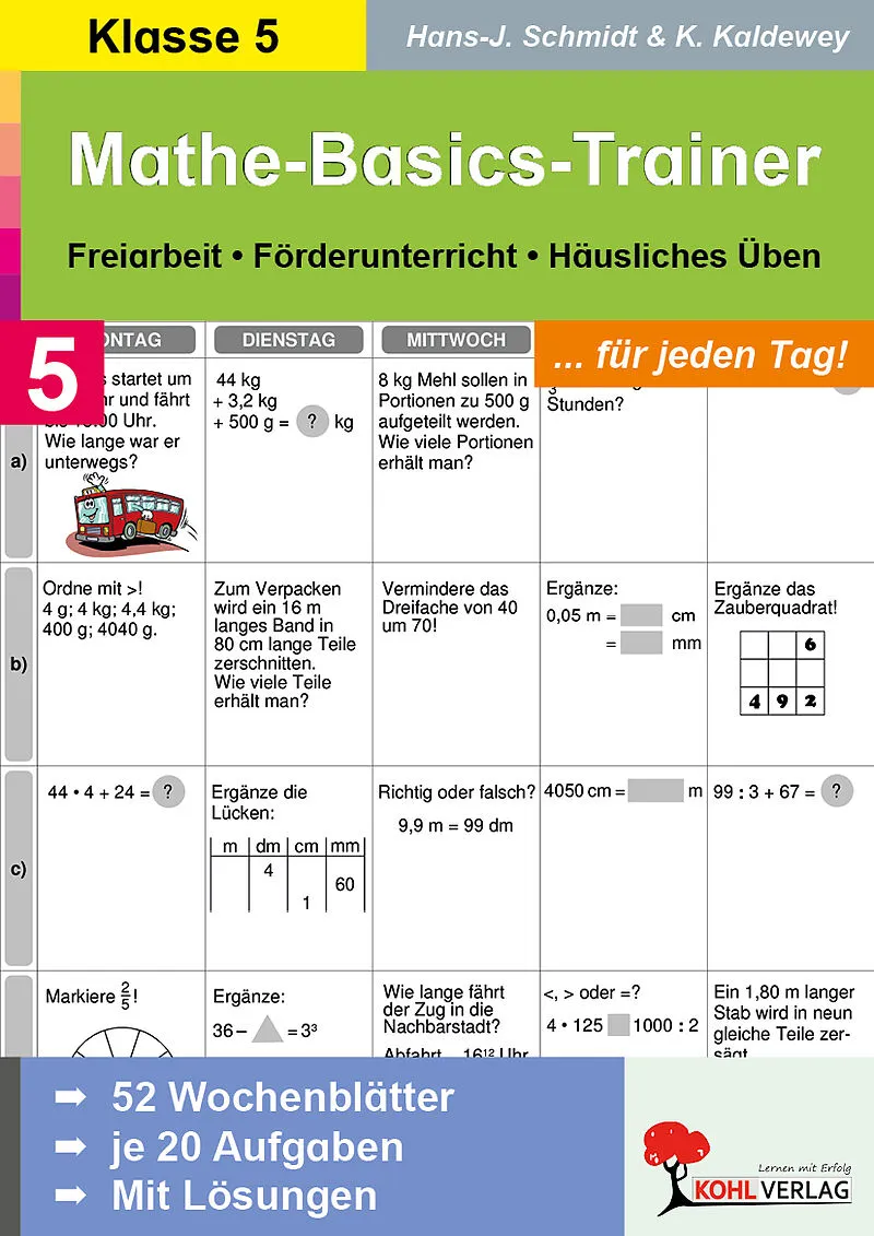 Diese Kopiervorlagen enthalten 52 Wochenblätter mit je 20 Aufgaben, also 4 Aufgaben für jeden Wochentag. Sie können gezielt im Sinne eines permanenten Trainings oder für Schüler mit Defi ziten eingesetzt werden. Dabei können die Aufgaben auch zum häuslichen Üb...