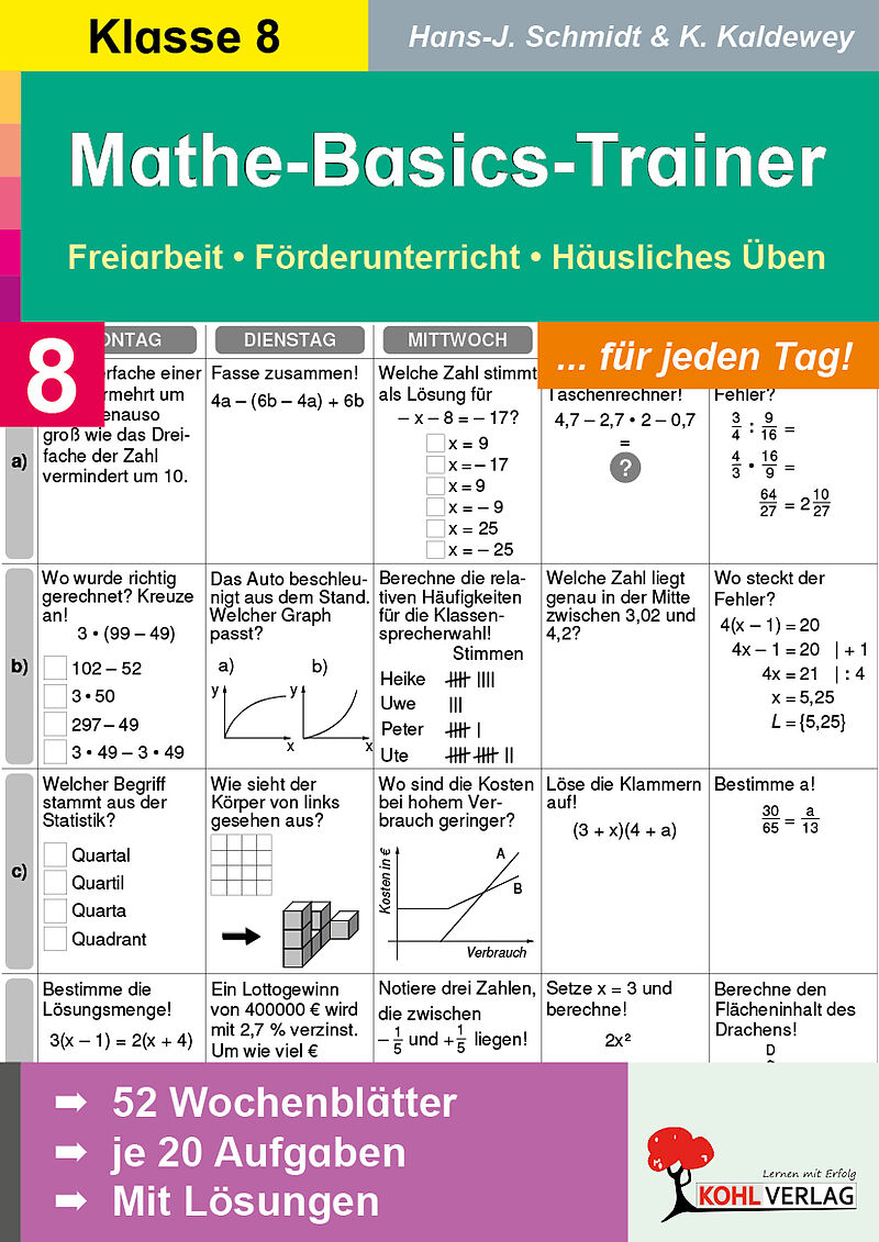 Diese Kopiervorlagen enthalten 52 Wochenblätter mit je 20 Aufgaben, also 4 Aufgaben für jeden Wochentag. Sie können gezielt im Sinne eines permanenten Trainings oder für Schüler mit Defi ziten eingesetzt werden. Dabei können die Aufgaben auch zum häuslichen Üb...