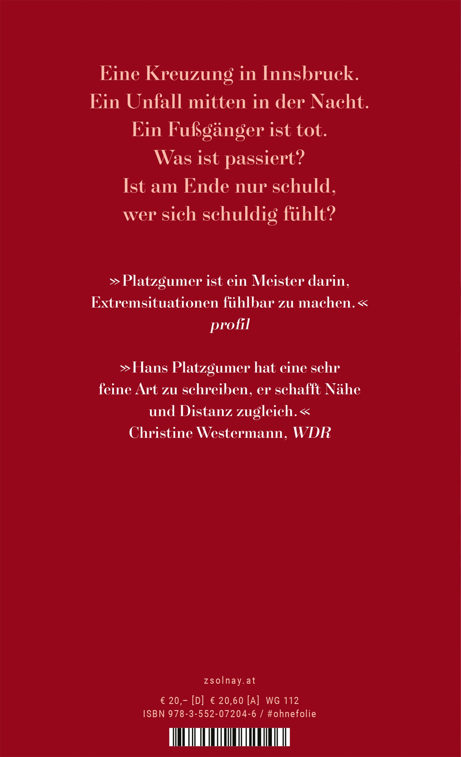 Hans Platzgumer ist ein Meister darin, Extremsituationen fühlbar zu machen (Profil). Der Autor von Am Rand fragt in seinem neuen Roman: Ist am Ende nur schuld, wer sich schuldig fühlt? Eine Kreuzung in Innsbruck. Ein Unfall mitten in der Nacht. Ein Fußgänger i...