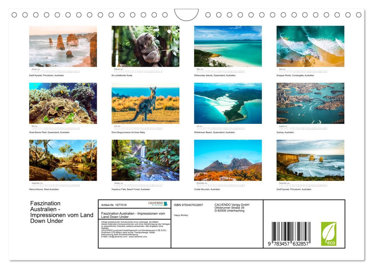 Das Great Barrier Reef, die atemberaubenden Städte, das Outback, die Natur, die Tiere und vieles mehr hat Australien zu bieten. Dieser Kalender gibt eine abwechslungsreiche Reise durch das wunderbare Land am anderen Ende der Welt.