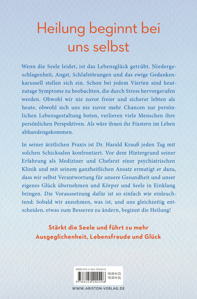 Heilung beginnt bei uns selbst Wenn die Seele leidet, ist das Lebensglück getrübt. Niedergeschlagenheit, Angst, Schlafstörungen und das ewige Gedankenkarussell stellen sich ein. Schon bei jedem Vierten sind heutzutage Symptome zu beobachten, die durch Stress h...