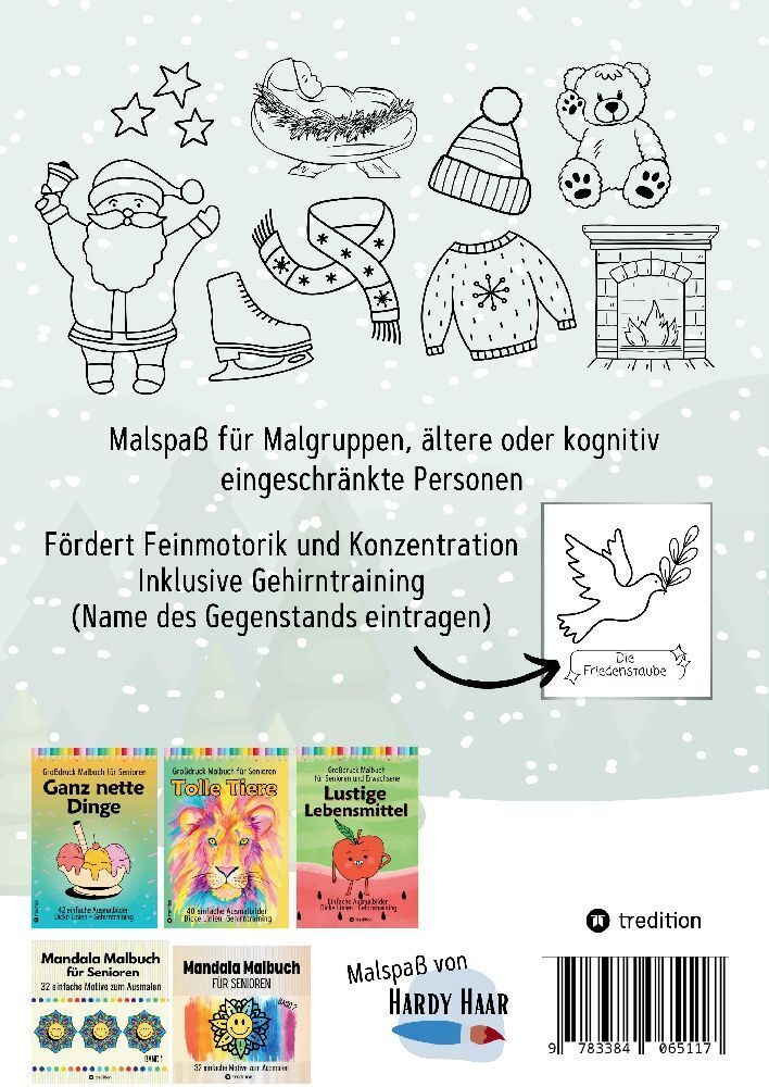 Ein Malbuch für Weihnachten und die Winterzeit besonders für Senioren, Malanfänger, Rentner und Malgruppen. 35 einfache Malseiten mit dicken Linien, durchnummerierten Seiten, großen Motiven sowie Gehirntraining. Fördert Konzentration und Feinmotorik sowie Ents...