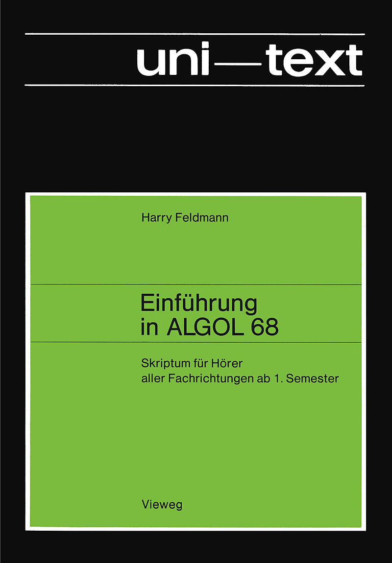0 Einleitung.- 0.1 Entwicklung von ALGOL 68.- 0.2 Einführende Beispiele.- 0.3 Schreibweisen.- 0.4 Testfragen.- 1 Objekte (Name, Wert, Art).- 1.1 Graphische Interpretation von Objekten.- 1.2 Produktionsschema für name.- 1.3 Übersichtsschema für Eigenname.- 1.4 Art eines Objekts.- 1.5 Testfragen.- 2 Felder und Strukturen.- 2.1 Felder.- 2.2 Strukturen.- 2.3 Testfragen.- 3 Programm, eigentliches Programm.- 3.1 Übersichtsschema für Programm.- 3.2 Eigentliches Programm.- 3.3 Eigentliches Vor- und Nachspiel.- 3.4 Testfragen.- 4 Geklammerte Klauseln.- 4.1 Übersichtsschema für ÄRT GEKLAMMERTE Klausel.- 4.2 Geklammerte serielle Klausel.- 4.3 Geklammerte kollaterale und synchronisierbare Klausel.- 4.4 Eigenfeld- und Eigenstruktur-Klausel.- 4.5 Geklammerte UNTERSCHEIDUNG Klausel.- 4.6 Schleifen-Klausel.- 4.7 Testfragen.- 5 Vereinbarungen.- 5.1 Vereinbarende BENENNUNG.- 5.2 Zielvereinbarung.- 5.3 Spezifikationsvereinbarung.- 5.4 Übersichtsschema für VEBART-Vereinbarung.- 5.5 Grund-Vereinbarung.- 5.6 Variablen-Vereinbarung.- 5.7 Routine-Vereinbarung.- 5.8 Operations-Vereinbarung.- 5.9 Vorrang-Vereinbarung.- 5.10 Art-Vereinbarung.- 5.11 Vereinbarer.- 5.12 Erklärer.- 5.13 Testfragen.- 6 Klauseln.- 6.1 Übersichtsschema für ÄRT Klausel.- 6.2 Implizite Konvertierung.- 6.3 Verweisung.- 6.4 Verweisidentitätsrelation.- 6.5 Prozedurtext siehe 7.2.1.- 6.6 Zielaufruf.- 6.7 Leerklausel.- 6.8 TERTIÄRKLAUSEL.- 6.9 SEKUNDÄRKLAUSEL.- 6.10 PRIMÄRKLAUSEL.- 6.11 Testfragen.- 7 Bereichsschachtelung und Prozeduren.- 7.1 Bereichsschachtelung.- 7.2 Prozeduren.- 7.3 Testfragen.- 8 Standard-Vereinbarungen (Originalfassung Revised Report).- 8.1 Abkürzende Schreibweisen.- 8.2 Abfragbare Rechner-Konstanten etc.- 8.3 Standard-Arten.- 8.4 Standard-Vorrang von Operationen.- 8.5Standard-Operationen.- 8.6 Standard-Funktionen etc.- 8.7 Standard-Synchronisierungs-Operationen etc.- 9 Datenübergabe.- 9.1 Dateien, Kanäle, Geräte (Bücher).- 9.2 Formatierte Übergabe.- 9.3 Unformatierte (Standard- Format-) Übergabe.- 9.4 Binäre Übergabe.- 9.5 Testfragen.- 10.1/9 Übungsaufgaben.- A Anhang.- A0 Kurze Einführung in zweischichtige Grammatiken.- A0.1/2 Definition zweischichtiger Grammatiken.- A0.3/5 Beispiel.- A1 Metazeichen, Zeichen, Startvokabel (englisch-deutsch).- A1.1 Metazeichen, Zeichen, Startvokabel.- A2 Schema der Metaregeln (englisch-deutsch).- A2.1 VOKABELER etc.- A2.2 ÄRT.- A2.3 FORMAT.- A2.4 NUMFORMAT, BITS, BYTES.- A2.5 KLAUSEL.- A2.6 NAME.- A2.7 VEBART etc.- A3 Schema der Hyperregeln (englisch-deutsch).- A3.1 Programm.- A3.2 serielle Klausel, kollaterale Klausel.- A3.3 geklammerte Unterscheidung, Klausel.- A3.4 Schleifen-Klausel.- A3.5 vereinbarende BENENNUNG mit NAME, Zielvereinbarung, Spezifikationsvereinbarung.- A3.6 VEBART-Vereinbarung.- A3.7/8 VEBART-Vereinbarungstext.- A3.9 Vereinbarer.- A3.10 Erklärer.- A3.12 Implizite Konvertierung.- A3.13 Klausel.- A3.14 TERTIÄR-, SEKUNDÄRKLAUSEL.- A3.15 PRIMÄRKLAUSEL.- A3.16 GEKLAMMERTE Klausel.- A3.17/8 Eigenbenennung.- A3.19 Formattext.- A3.21 abkürzende Redewendungen.- A3.22/7 Aussagenformen.- A3.28 Graph der Aussagenformen.- A4 Darstellung von Symbolvokabeln (englisch-deutsch).- A4.1 Buchstaben-, Eigennamen-Symbolvokabeln.- A4.2 Operator-, Vereinbarungs-, Art-Symbolvokabeln.- A4.3 Programmgliederungs-, Schleifen-, Kompragmentar-Symbolvokabeln.- A4.4 Zusatzregeln zur Darstellung von Name Symbol.- L Literaturverzeichnis.- L1 Buchliteratur zu Revised ALGOL 68.- L2 Eine Auswahl von Algorithmen-und Aufgabensammlungen.- 11/27 Alphabetischer Index.