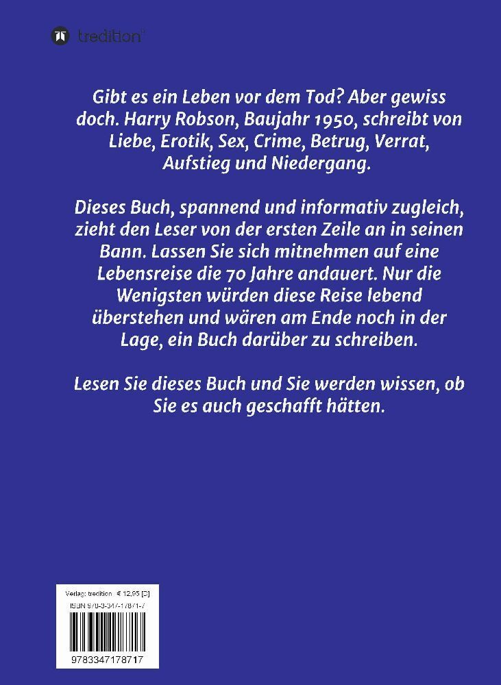 Gibt es ein Leben vor dem Tod? Aber gewiss doch. Harry Robson, Baujahr 1950, schreibt von Liebe, Lebensglück, Sex, Crime, Betrug, Auf- und Abstieg. Dieses Buch, spannend und informativ zugleich, zieht den Leser von der ersten Zeile an in seinen Bann. Lassen Si...