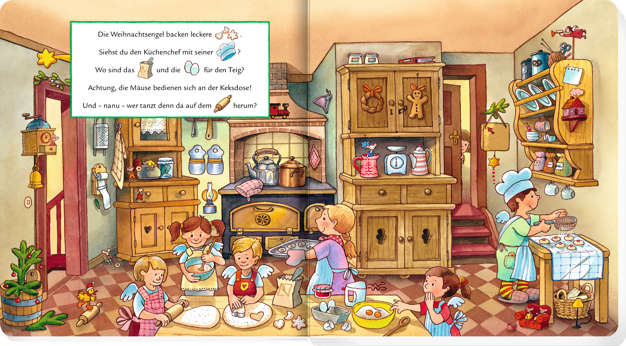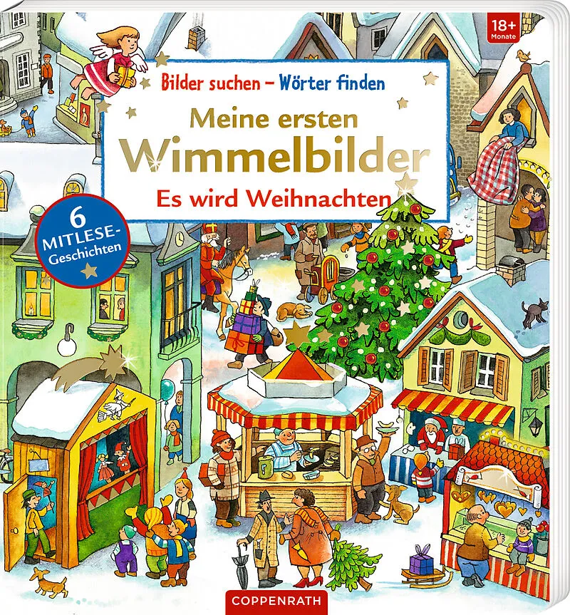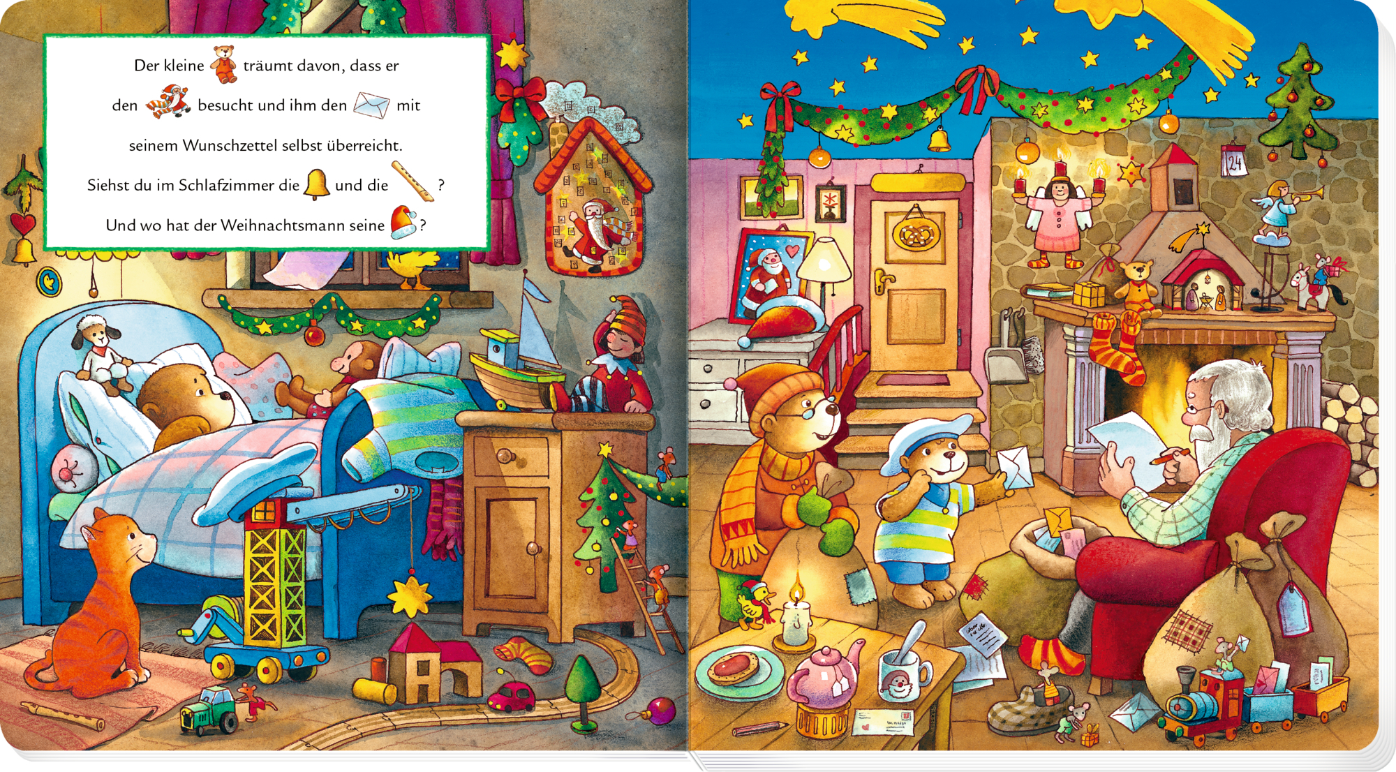 In der Küche werden leckere Plätzchen gebacken und die Engel verpacken in ihrer Werkstatt die Geschenke. Der kleine Bär träumt vom Weihnachtsmann. Auf der Piste rasen die Skifahrer und die Schlittenfahrer um die Wette. Ganzseitige Wimmelbilder und einfache Mi...