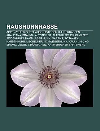 Quelle: Wikipedia. Seiten: 36. Kapitel: Appenzeller Spitzhaube, Liste der Hühnerrassen, Araucana, Brahma, Altsteirer, Altenglischer Kämpfer, Seidenhuhn, Hamburger Huhn, Marans, Posawien-Haubenhuhn, Mechelner, Schweizerhuhn, Kaulhuhn, Ko Shamo, Denizli-Kräher, ...Quelle: Wikipedia. Seiten: 36. Kapitel: Appenzeller Spitzhaube, Liste der Hühnerrassen, Araucana, Brahma, Altsteirer, Altenglischer Kämpfer, Seidenhuhn, Hamburger Huhn, Marans, Posawien-Haubenhuhn, Mechelner, Schweizerhuhn, Kaulhuhn, Ko Shamo, Denizli-Kräher, Asil, Antwerpener Bartzwerg, Appenzeller Barthuhn, Deutsches Zwerghuhn, Ostfriesische Möve, Malaie, Andalusier, Amrock, Yokohama, Bergischer Kräher, Zwerg-Welsumer, Orpington, Leghorn, Bielefelder Zwerg-Kennhuhn, Sulmtaler, Cochin, Barnevelder, Australorp, Sebright, Zwerg-Cochin, Brakel, Deutscher Sperber, Bantam, Friesenhuhn, Cemani, Vorwerkhuhn, Bergischer Schlotterkamm, Deutsches Lachshuhn, Annaberger Haubenstrupphuhn, Zwerghühner, Paduaner, Ramelsloher, Brabanter, Wyandotte, Sussex, Croad-Langschan, Deutsches Reichshuhn, Deutsches Langschan, Watermaalscher Bartzwerg, Augsburger, Dresdner, Zwerg-Sulmtaler, Kosovo Langkräher, Hint Horoz, Assendelfter Huhn, Westfälischer Totleger, Bressehuhn, Zwerg-Orpington, Brabanter Bauernhuhn, Serama, Zwergfriesenhuhn, Bassetten, Yamato Gunkei, Dorking, Sundheimer, Ardenner, Okina-Chabos, Empordanesa, Bohus-Dal Schwarzhuhn, New Hampshire, Italiener, Holländisches Haubenhuhn, Ohiki, Madras, Grünleger, Houdan. Auszug: Die Appenzeller Spitzhaube (in der Schweiz auch: Gässerschnäpfli oder Tschüpperli) ist eine Haushuhnrasse aus dem Appenzellerland in der Schweiz. Die Rasse wurde erstmals 1952 eingetragen, soll aber bereits im 15. Jahrhundert in Klöstern des Alpenraumes gezüchtet worden sein. Als Vorfahren werden Brabanter, eine alte niederländische Rasse, sowie zwei französische Rassen "La Flèche" und "Crève-Coeur" vermutet. Das Markenzeichen der Appenzeller Spitzhaubenhühner ist ihr auffälliger Kopfschmuck: die schmale, nach vorne geneigte Federhaube, welche an die Trachtenhaube der Appenzeller Sonntagstracht erinnert sowie die beiden "Hörner" des Kammes. Das Appenzeller Spitzhaubenhuhn ist ideal an die Bedingungen der Berge angepasst, klettert vorzüglich auf felsigem Grund und kann gut fliegen. Gerne übernachtet es auf Bäumen, sogar im Winter. Da es nur kleine Kehllappen und statt eines Kammes zwei kleine Hörnchen besitzt, kann ihm auch der strengste Frost kaum etwas anhaben. Hennen wiegen nur wenig über ein Kilogramm und Hähne kaum über 1.5 kg. Spitzhaubenhühner sind relativ gute Leger: Im ersten Jahr legen sie ca. 150 weissschalige, 55 Gramm schwere Eier. Ihr Bruttrieb ist gering. Im letzten Jahrhundert gab es mehr als zehn verschiedene Farbschläge dieser Rasse. Bis heute haben nur deren fünf überlebt: am häufigsten sind die silber-schwarz-getupften. Viel seltener und auf der Liste von ProSpecieRara sind die gold-schwarz-getupften, reingoldenen, schwarzen und reinweissen Schläge. Die Junghähne lassen sich ab der 8-9 Woche anhand der Hörnchen und der im Vergleich mit deren Schwestern grösseren Kehllappen erkennen. Zuchtziele: Appenzeller Spitzhaubenhuhn gold-schwarzgetupftDas Spitzhaubenhuhn soll bereits im 15. Jahrhundert in Klöstern des Alpenraums gezüchtet worden sein. Zu den Stammeltern der Spitzhauben dürften die Brabanter, eine alte niederländische Rasse, sowie zwei französische Geflügelvertreter, die "La Flèche" und "Crève-Coeur" Hühner, zählen. Im 20. Jahrhundert blieben