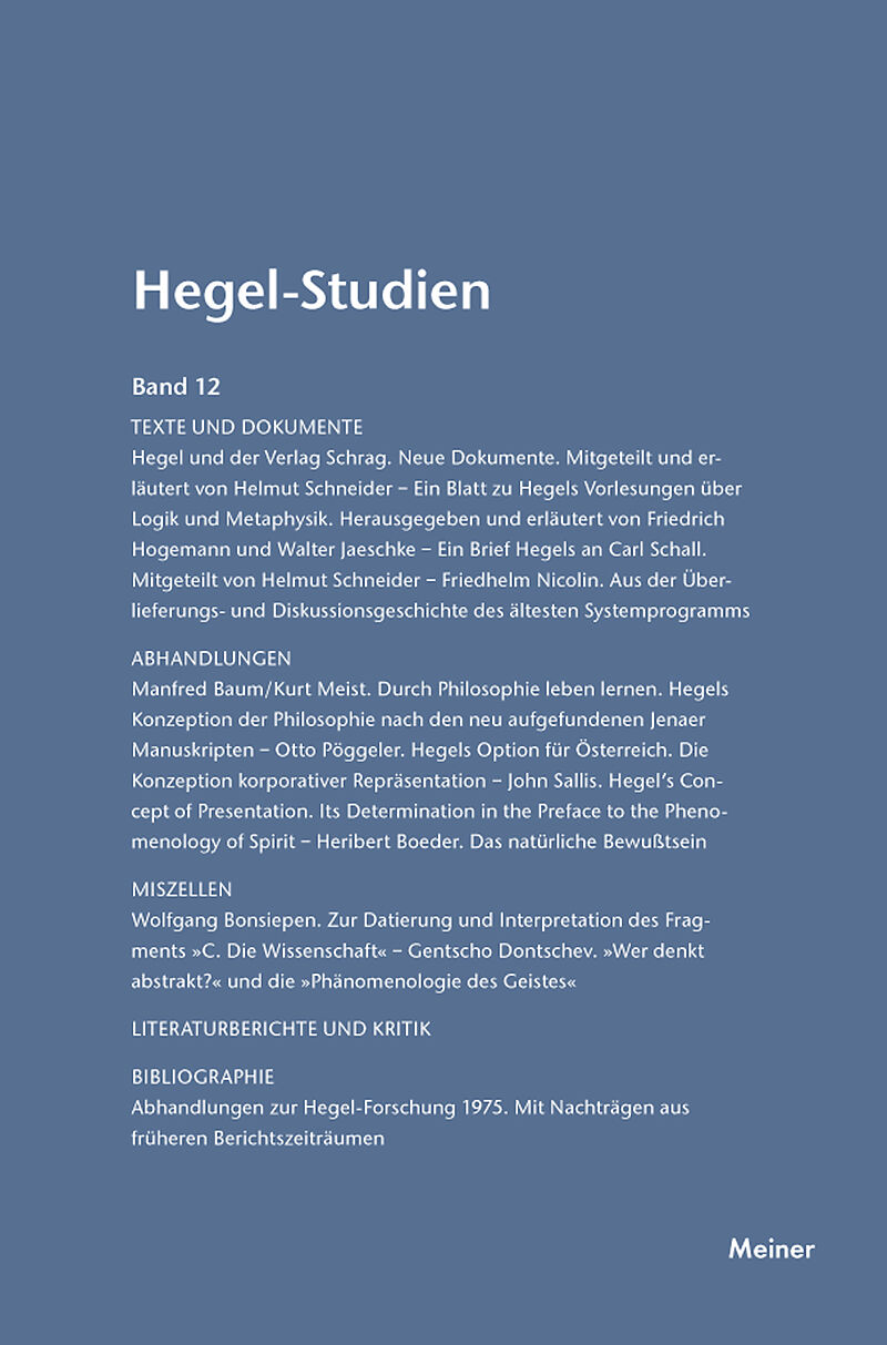 Die Hegel-Studien dokumentieren seit 1961 die neuen Ansätze und Ergebnisse auf allen Gebieten der internationalen Hegel-Forschung. Zusätzlich sind die Hegel-Studien seit 2013 auch für andere Autoren und Debatten der Klassischen Deutschen Philosophie offen und ...