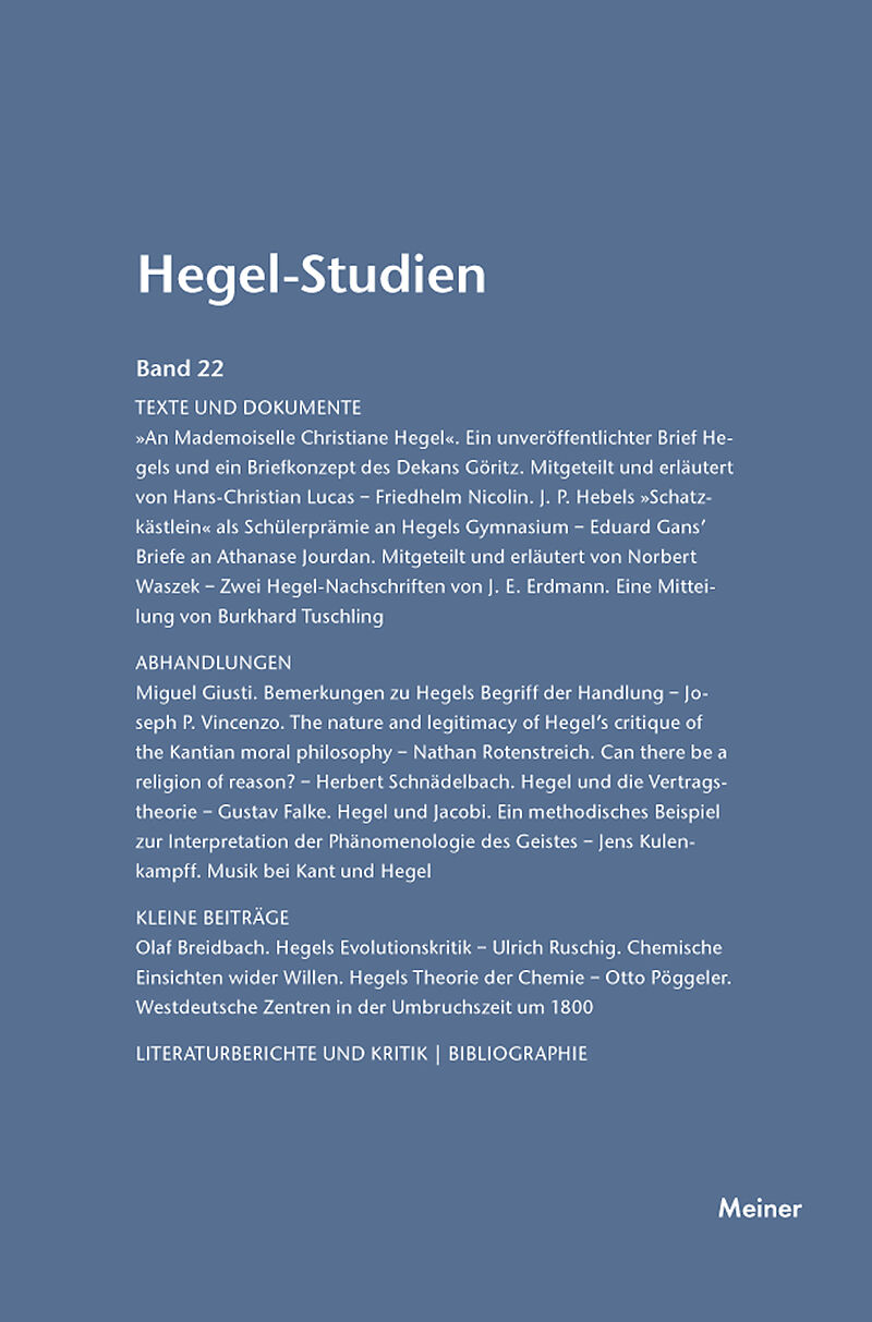 Die Hegel-Studien dokumentieren seit 1961 die neuen Ansätze und Ergebnisse auf allen Gebieten der internationalen Hegel-Forschung. Zusätzlich sind die Hegel-Studien seit 2013 auch für andere Autoren und Debatten der Klassischen Deutschen Philosophie offen und ...
