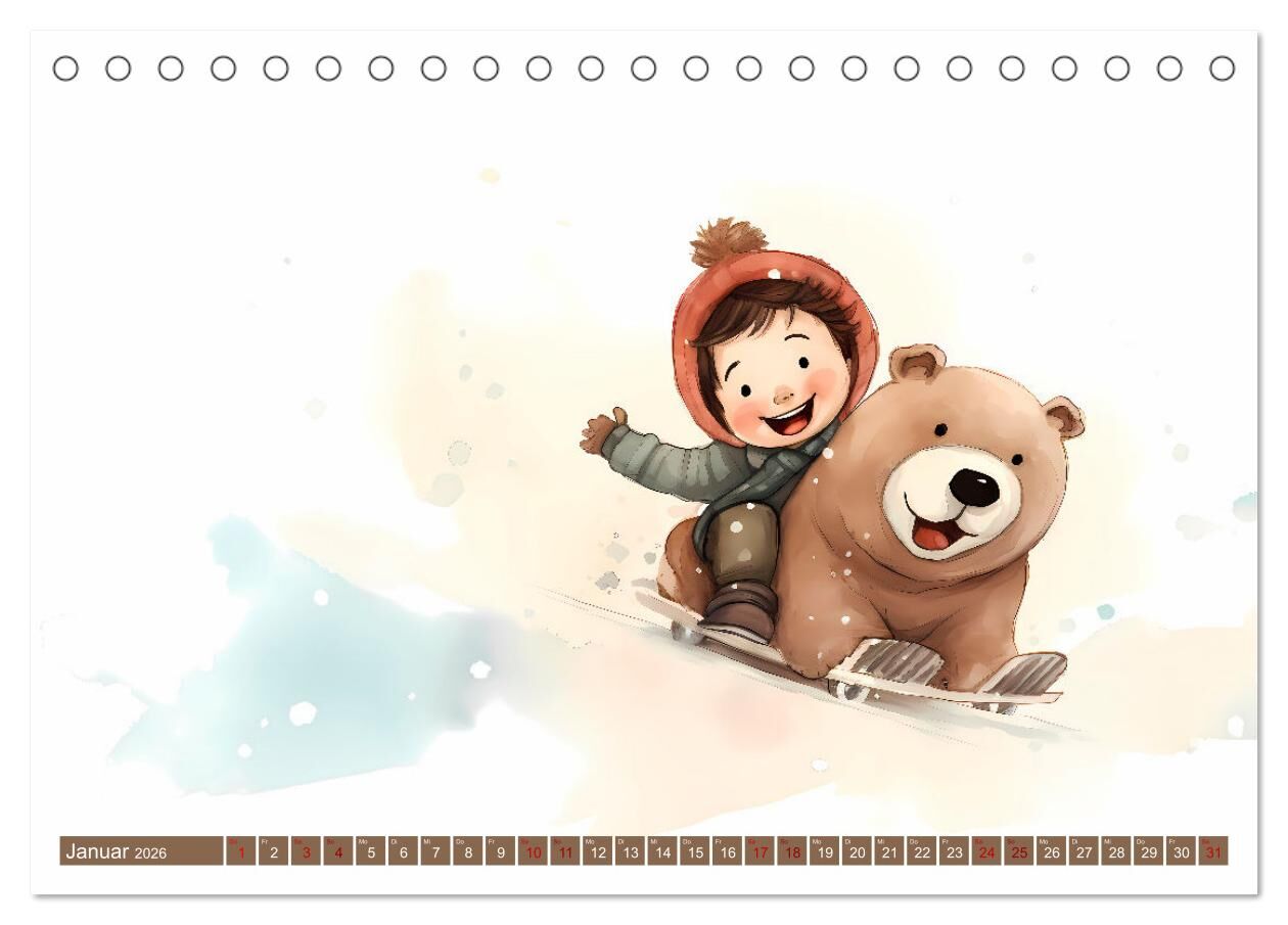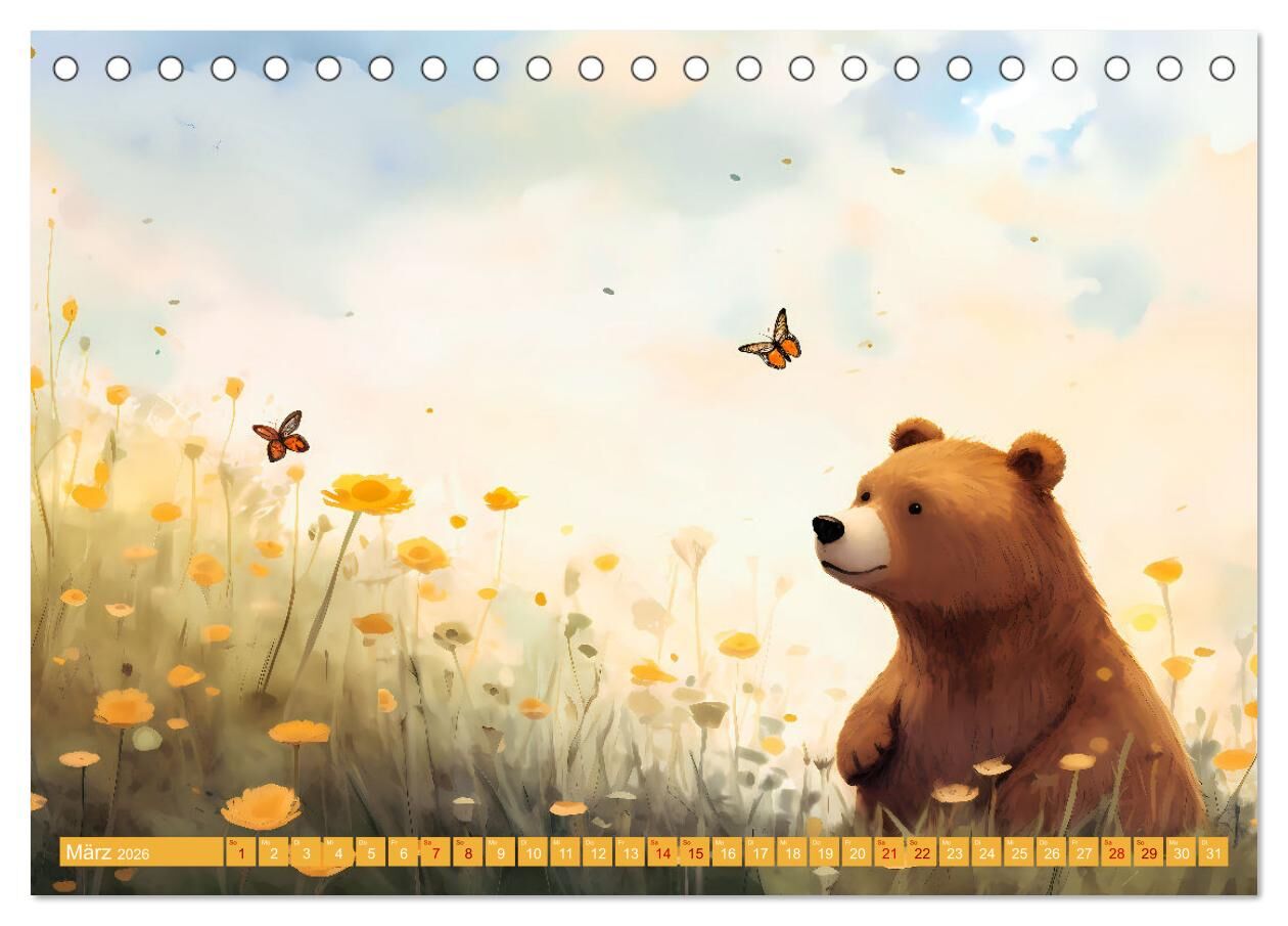 Ein kinderfreundlicher Kalender ziert den Raum mit niedlichen Illustrationen eines Bären. Jeder Monat enthält eine reizende Darstellung des Bären in verschiedenen Abenteuern und Situationen, die Kinder ansprechen. Der Bär kann im Januar Schlitten fahren, im Fe...